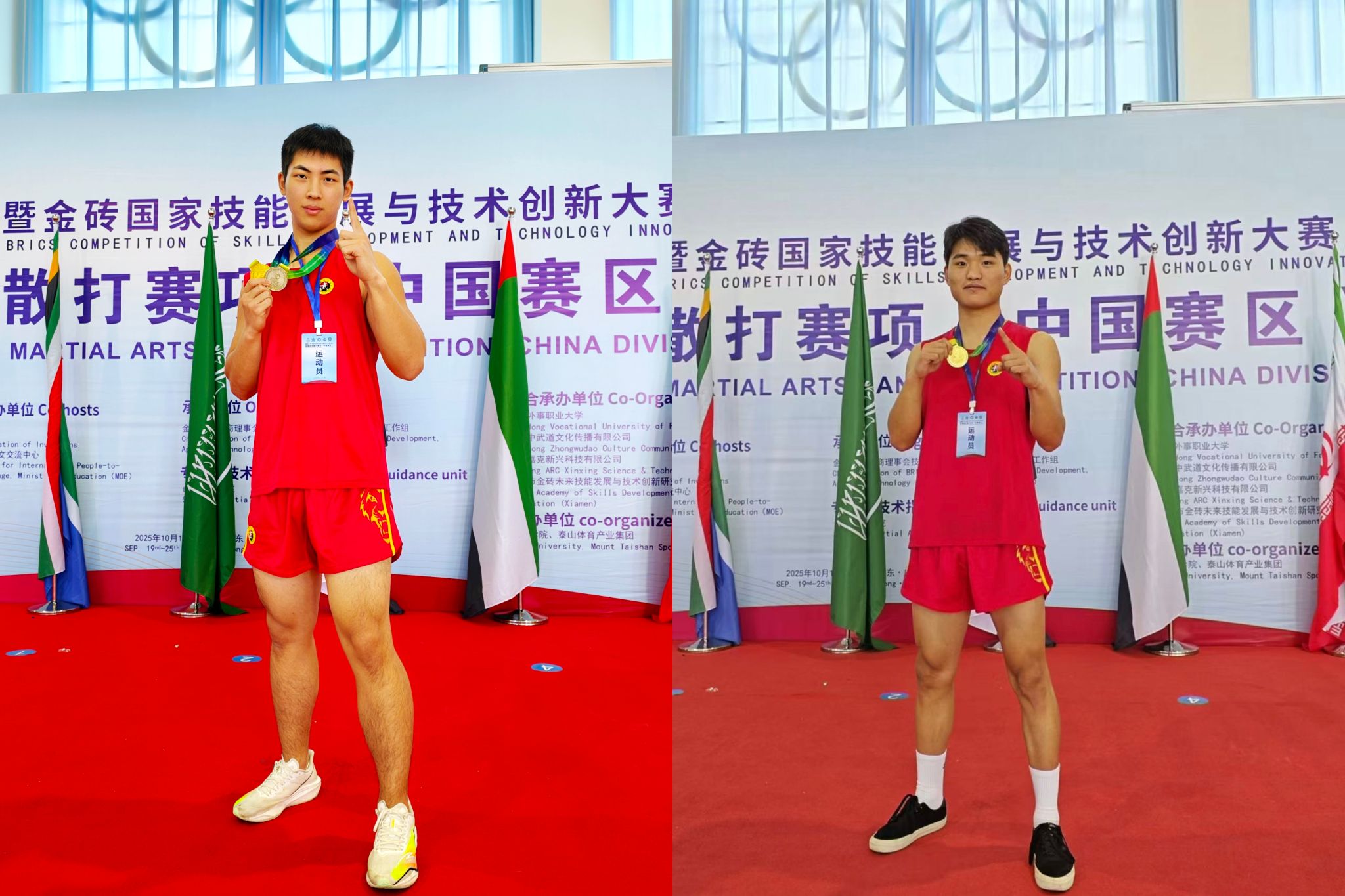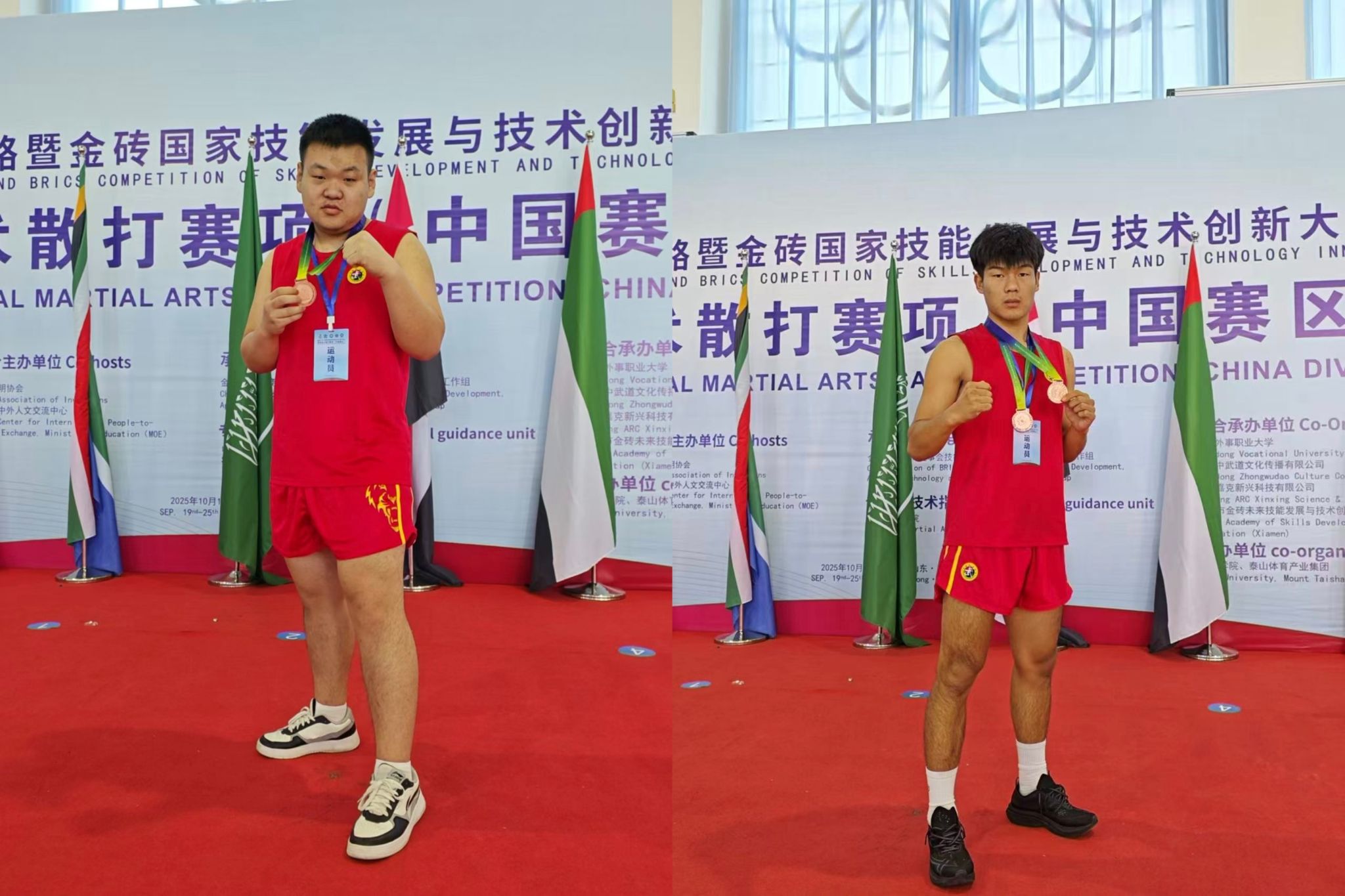10月19日至25日,2025一带一路暨金砖国家技能发展与技术创新大赛之首届武术散打赛项(中国赛区)在山东外事职业大学举办。本次赛事共有全国55所院校、381名选手参加,我校代表队在领队耿晓东及教练员赵蒙、李涛、杜先刚的带领下,凭借过硬实力与顽强斗志斩获一等奖2项、二等奖2项、三等奖4项,在国家级赛场充分展现我校体育育人成效与竞技风采!