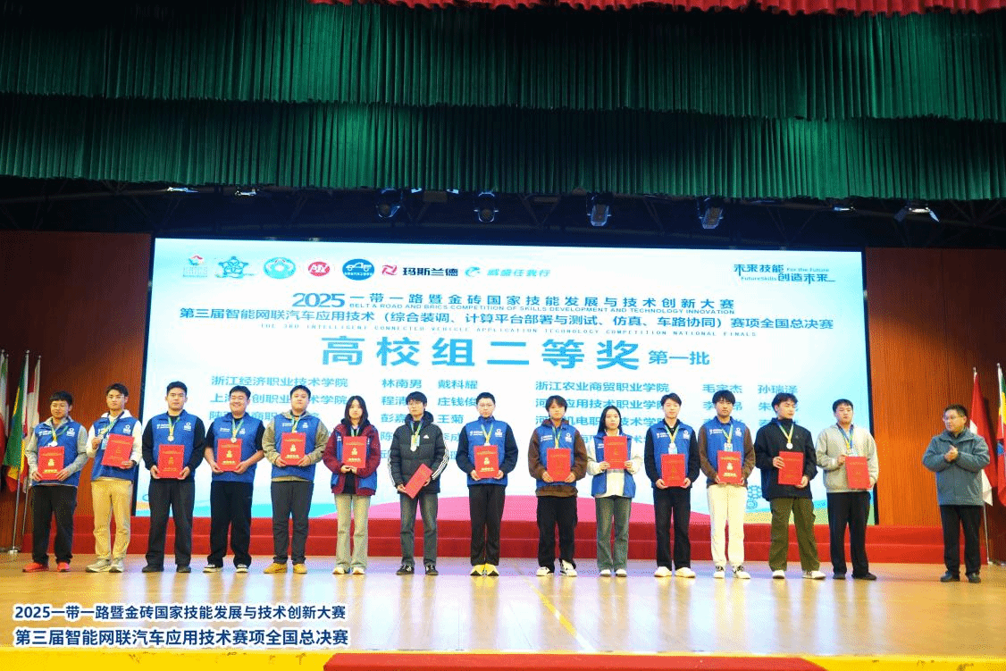 近日,2025一带一路暨金砖国家技能发展与技术创新大赛第三届智能网联汽车应用技术赛项全国总决赛在安徽汽车职业技术学院圆满落幕。经过激烈比拼,我校汽车工程系的两支教师代表队(王菲、魏霞、暴焱、王宇)凭借扎实的专业技能,获得职工组一等奖2项。同时,由韩龙海、董立亮等老师指导的两支学生代表队(李晨光、秦浩然、李奕锋、赵彧鑫)表现优异,获得高校组二等奖2项。