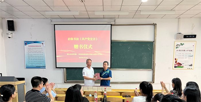 傅恒杰和周景辉进行了赠书交接仪式。傅恒杰表示,启体书法版《共产党宣言》实现了中华传统文化与科学社会主义的结合,教师们可以将该书运用于教学实践中,让学生在欣赏艺术美的同时,熏陶对党和社会主义的热爱。