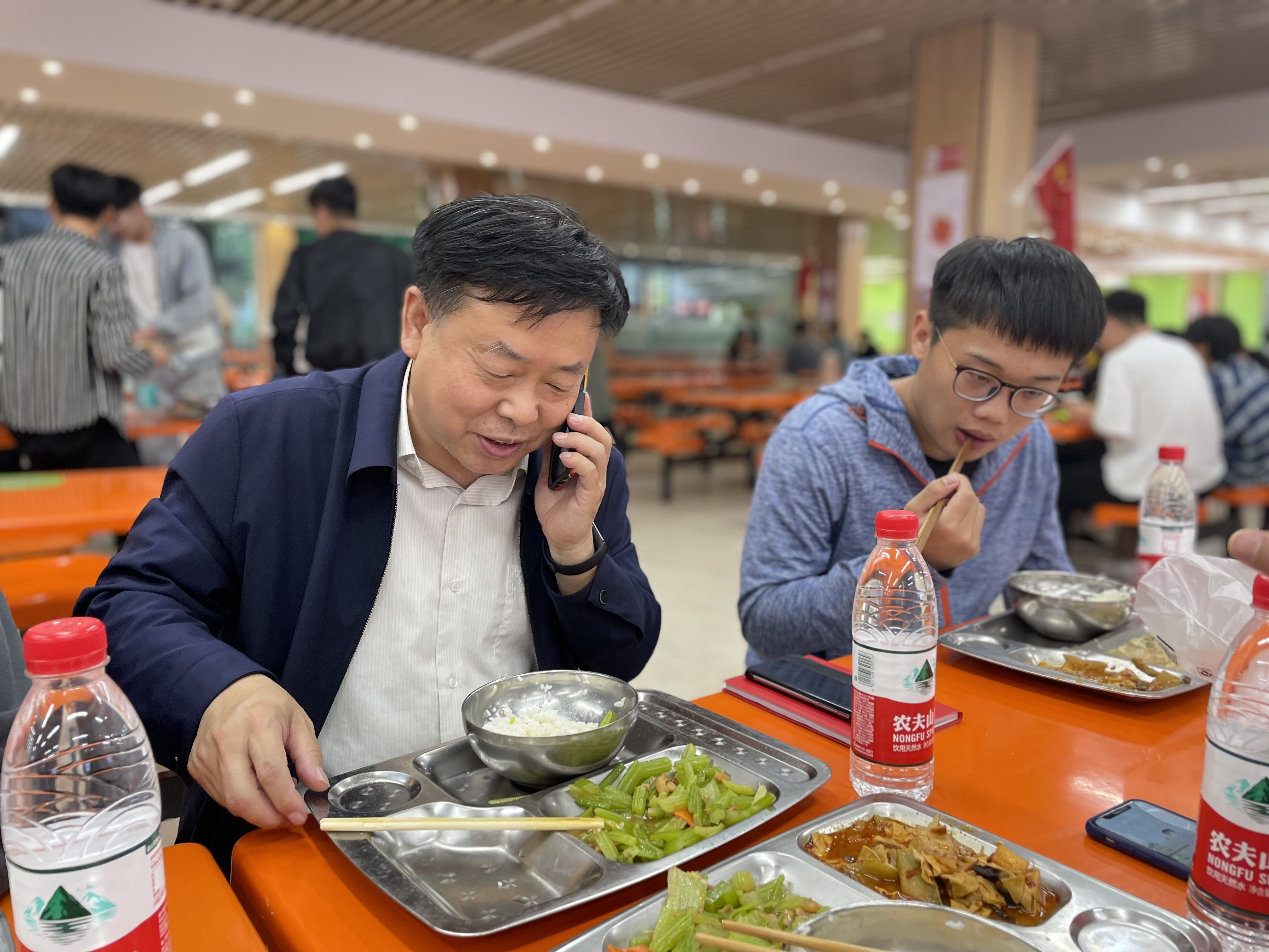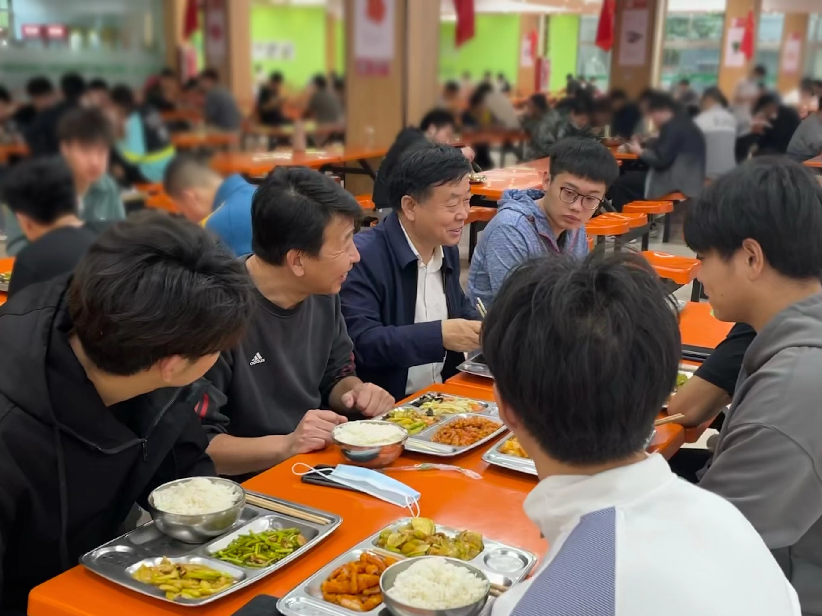 随后,王振京来到学校食堂一楼餐厅与休闲体育2101班的同学们一起用餐,了解食堂饭菜的品种、质量、价格、卫生和安全等情况,了解同学们每日用餐状况,听取了他们对于食堂饭菜、用餐环境、管理建设等方面的意见和建议。与学生家长联系,反馈学生的在校情况以及学院的防疫措施,让家长放心。