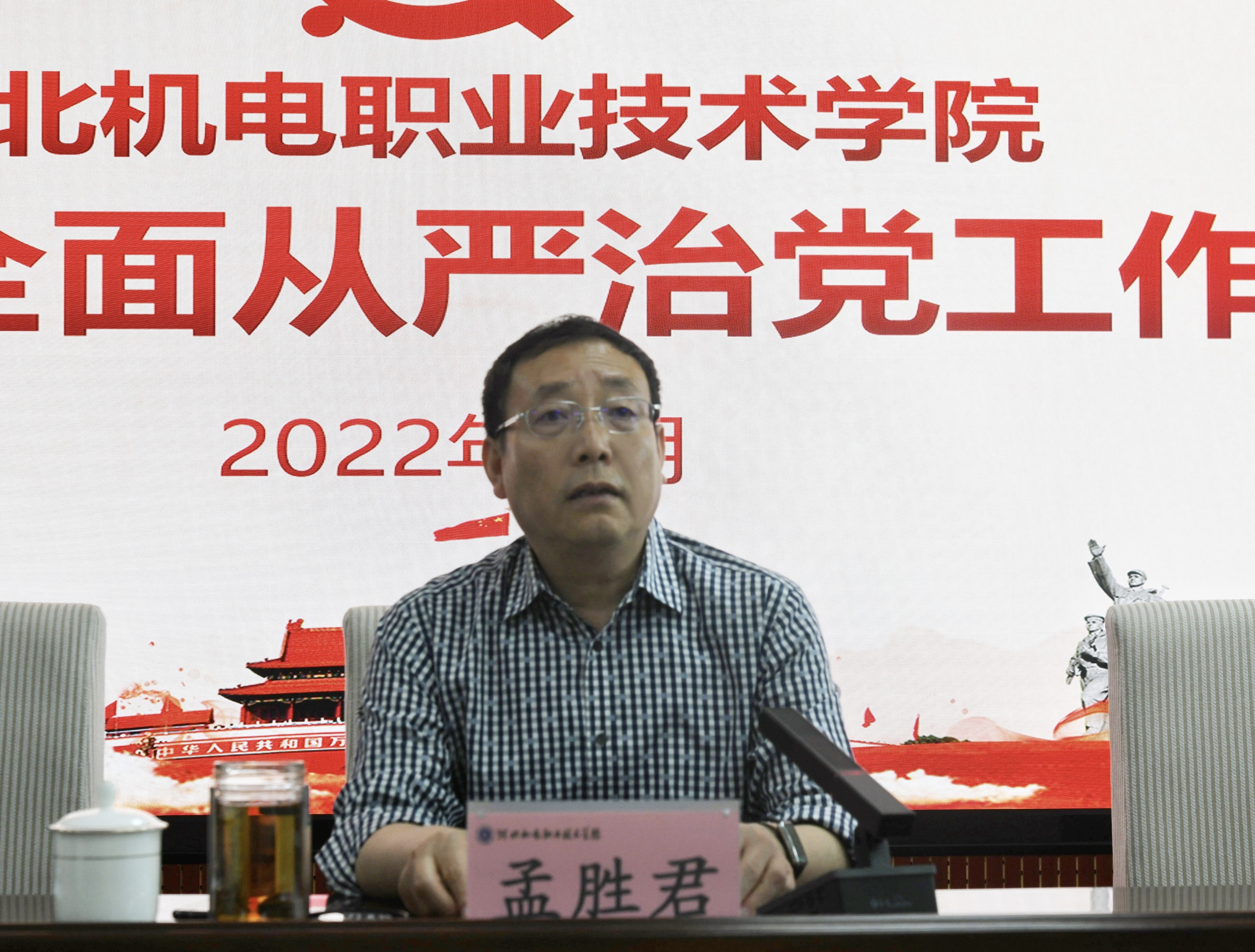 孟胜君对学院2022年全面从严治党工作进行了全面部署,他指出,2022年是党的二十大召开之年,做好今年的全面从严治党工作意义重大,要深入开展“树正气、促发展、爱机电、比贡献”大行动;强化思想建设,全面筑牢理想信念根基;加强组织建设,提高党组织的凝聚力和战斗力;加强制度建设,着力推动管党治党责任落地生根;加强作风建设,努力构建风清气正的育人生态;抓好常态化疫情防控,坚决筑牢疫情安全防线。