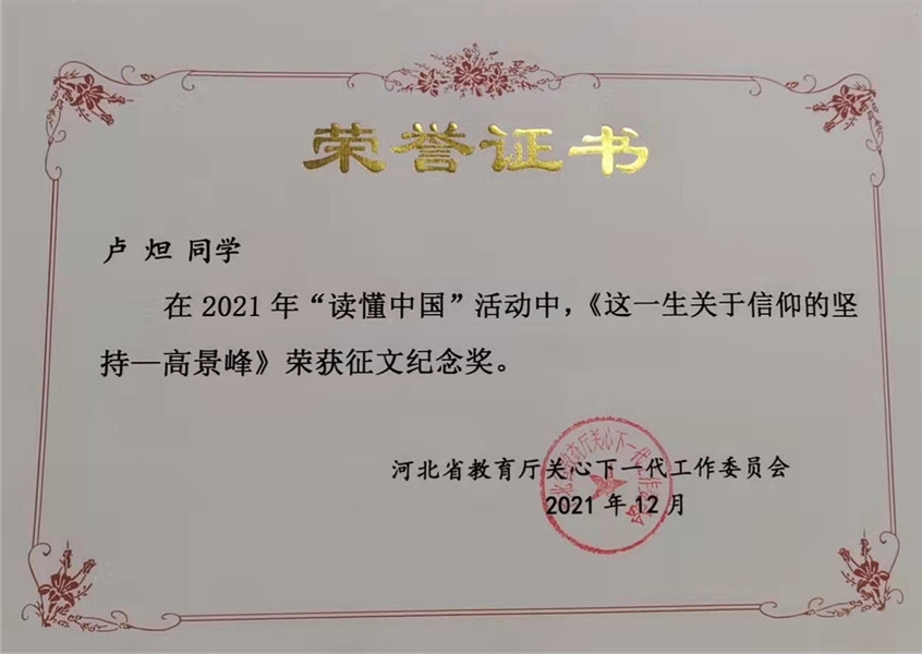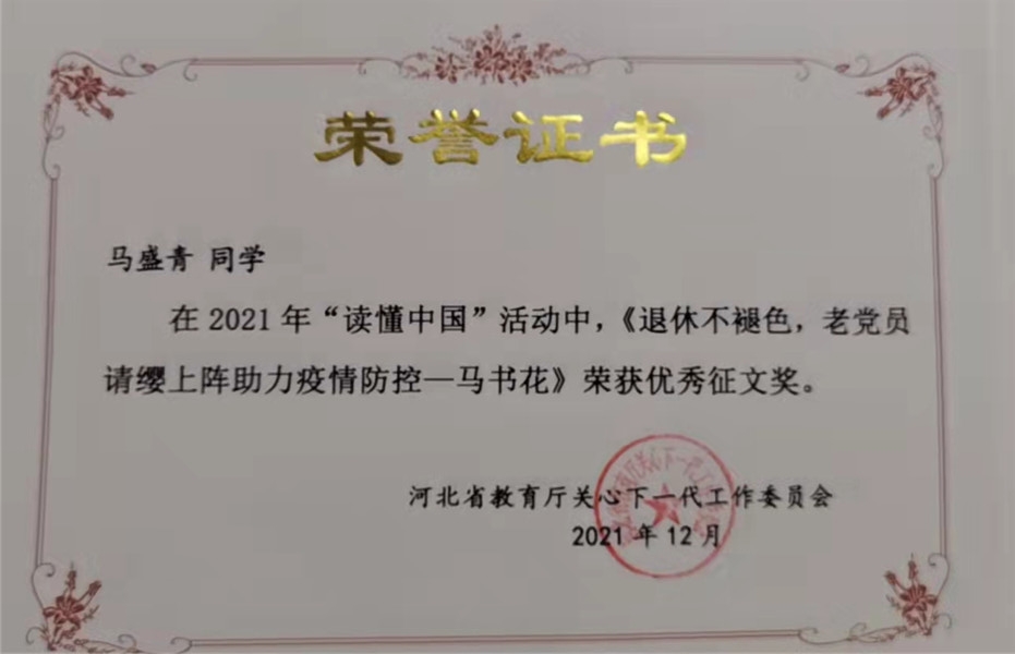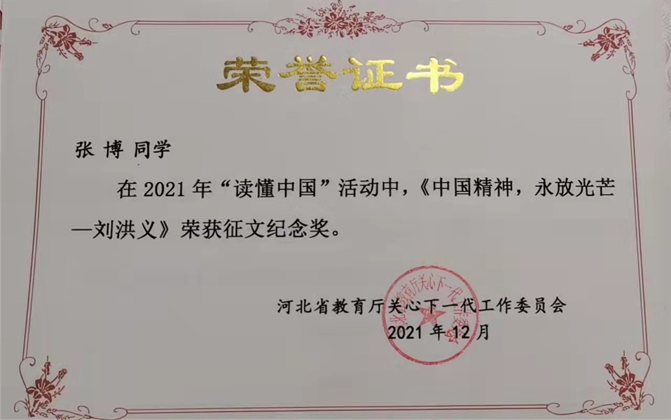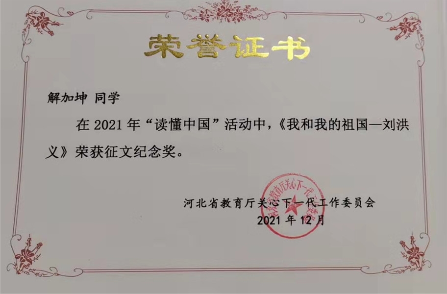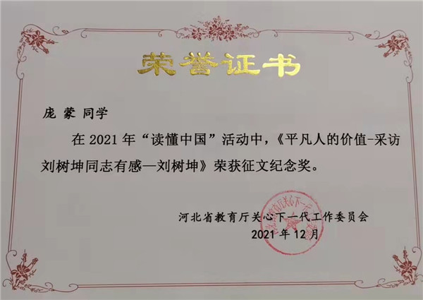 近日,省教育厅关工委公布了2021年“读懂中国”活动作品评审结果。学院报送的征文作品全部获奖。学院获优秀组织奖,这是学院继2019年、2020年后,再次取得此项荣誉!