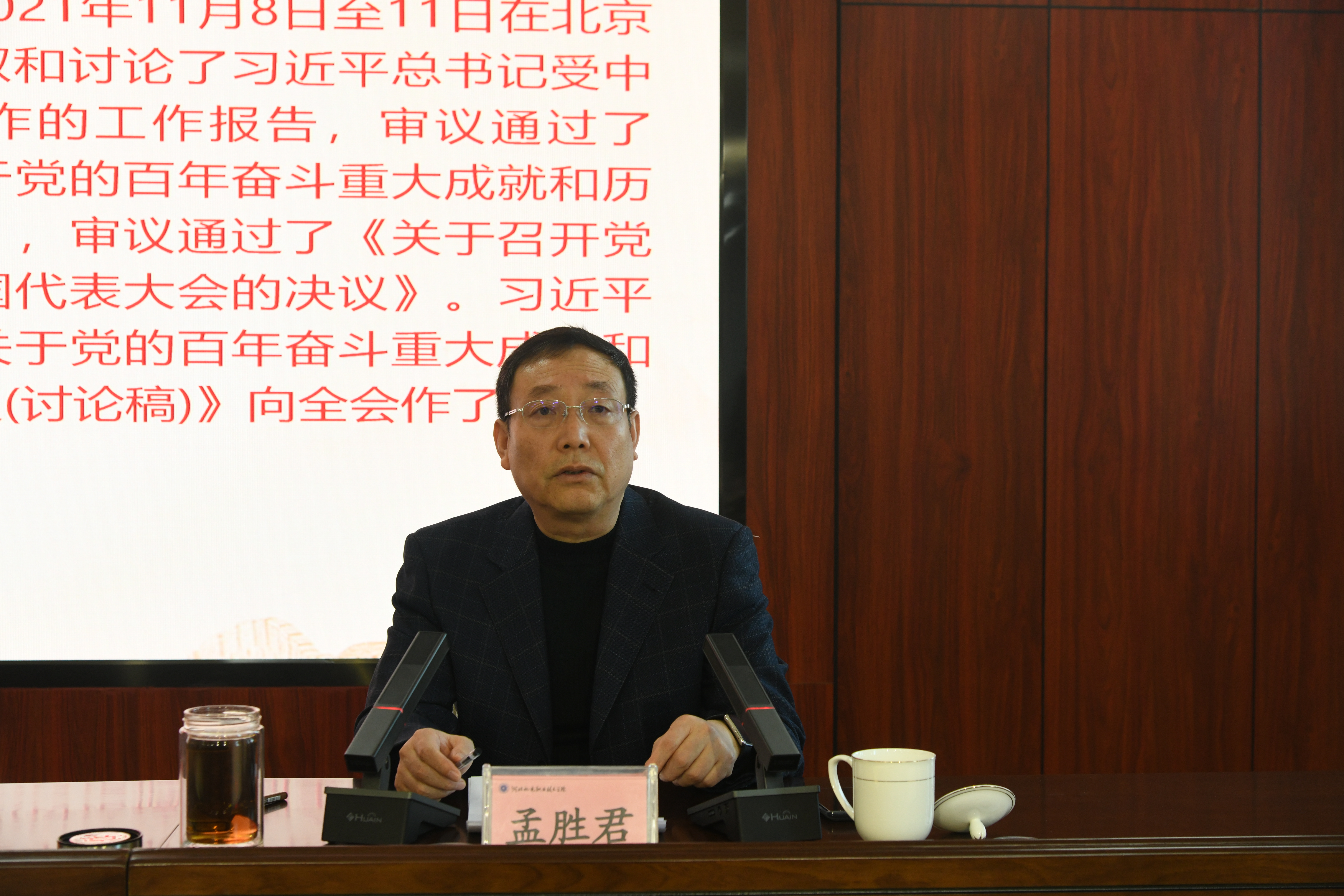 孟胜君指出,党的十九届六中全会是在我们党成立100周年的重要历史时刻,在党和人民胜利实现第一个百年奋斗目标、全面建成小康社会,正在向着第二个百年奋斗目标迈进的重大历史关头召开的一次重要会议。全会通过的《中共中央关于党的百年奋斗重大成就和历史经验的决议》是一篇马克思主义的纲领性文献,是新时代中国共产党人牢记初心使命、坚持和发展中国特色社会主义的政治宣言,是以史为鉴、开创未来、实现中华民族伟大复兴的行动指南。党中央号召,全党全军全国各族人民要更加紧密地团结在以习近平同志为核心的党中央周围,全面贯彻习近平新时代中国特色社会主义思想,大力弘扬伟大建党精神,勿忘昨天的苦难辉煌,无愧今天的使命担当,不负明天的伟大梦想,为实现第二个百年奋斗目标、实现中华民族伟大复兴的中国梦而不懈奋斗。我们坚信,在过去一百年赢得了伟大胜利和荣光的中国共产党和中国人民,必将在新时代新征程上赢得更加伟大的胜利和荣光!