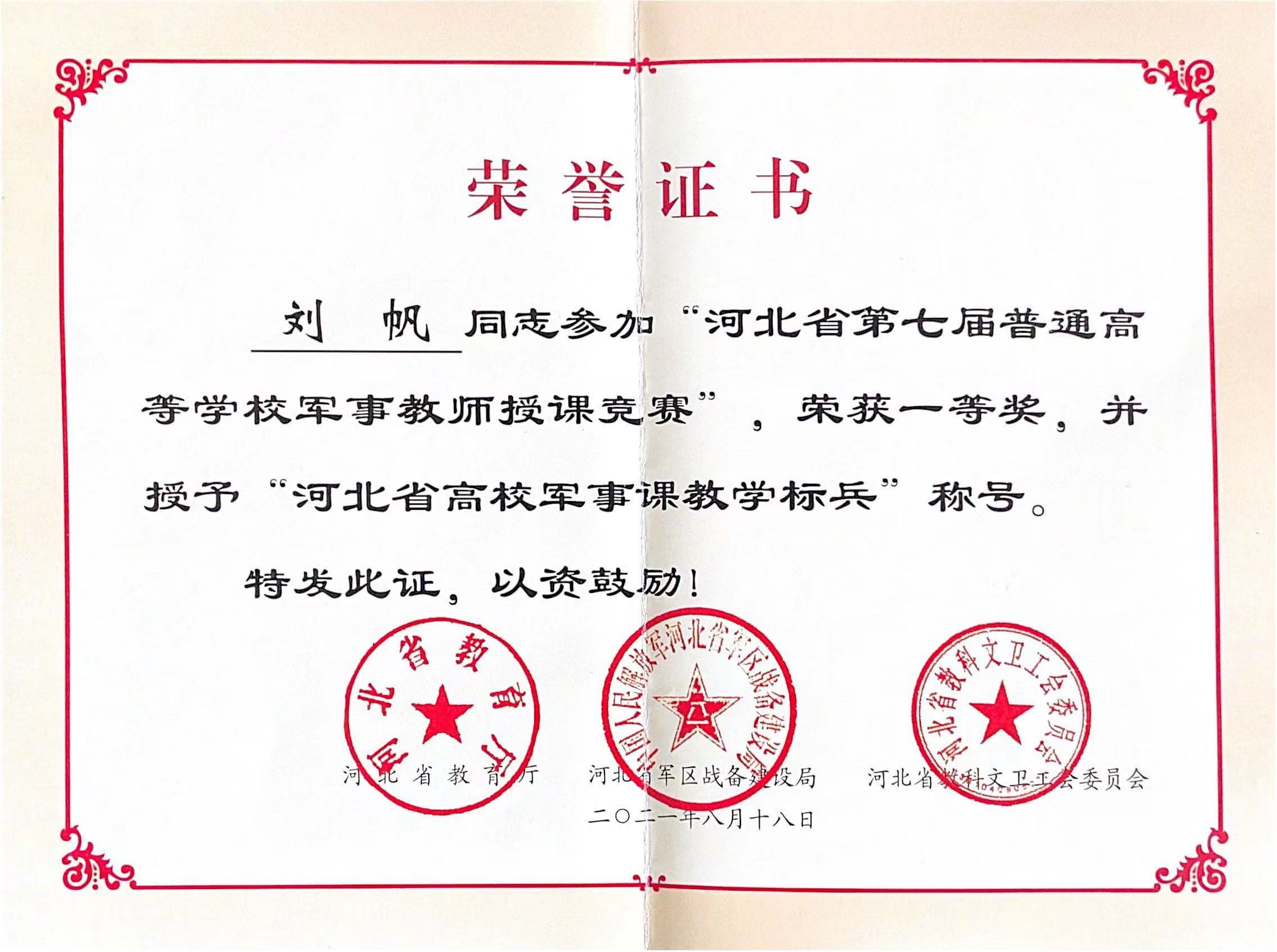 7月12日至15日,由河北省教育厅、河北省军区战备建设局、河北省教科文卫工会联合举办的“河北省第七届普通高等学校军事教师授课竞赛”在石家庄举行,我院体育工作部辅导员刘帆老师代表学校参加了此次比赛,在全省报名参赛的118名选手中脱颖而出,荣获河北省军事理论课竞赛一等奖,并获评“河北省军事理论课教学能手”荣誉称号。