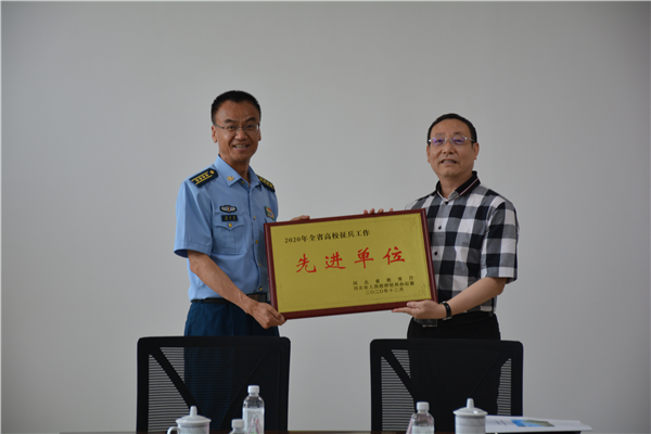 郑志洲为学院颁发河北省2020年全省高校征兵工作先进单位荣誉牌匾。