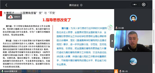 为深入贯彻落实全国高校思想政治工作会议精神和《普通高等学校辅导员队伍建设规定》,进一步加强学院辅导员队伍建设,全面提升学院辅导员综合素质,3月3日下午,学院邀请第五届全国辅导员年度人物入围奖、教育部高校思想政治工作队伍培训研修中心入库专家、河北交通职业技术学院范桂森老师对全体辅导员进行以《河北省高校辅导员素质能力大赛政策解读》为主题的线上培训会,各系部党总支书记、副书记和全体辅导员参加培训会。