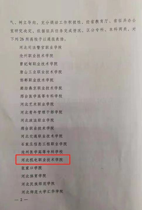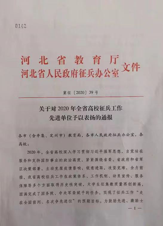 近日,河北省教育厅、河北省人民政府征兵办公室联合印发了《关于对2020年全省征兵工作先进单位予以表扬的通报》,对全省26所高校予以通报表扬。其中,我院获“河北省征兵工作先进单位”荣誉称号。
