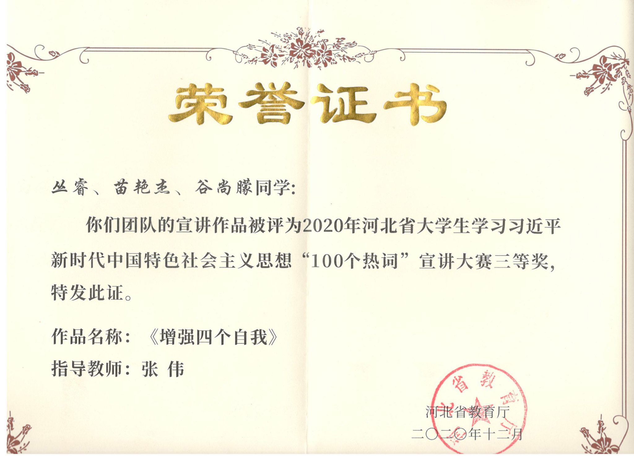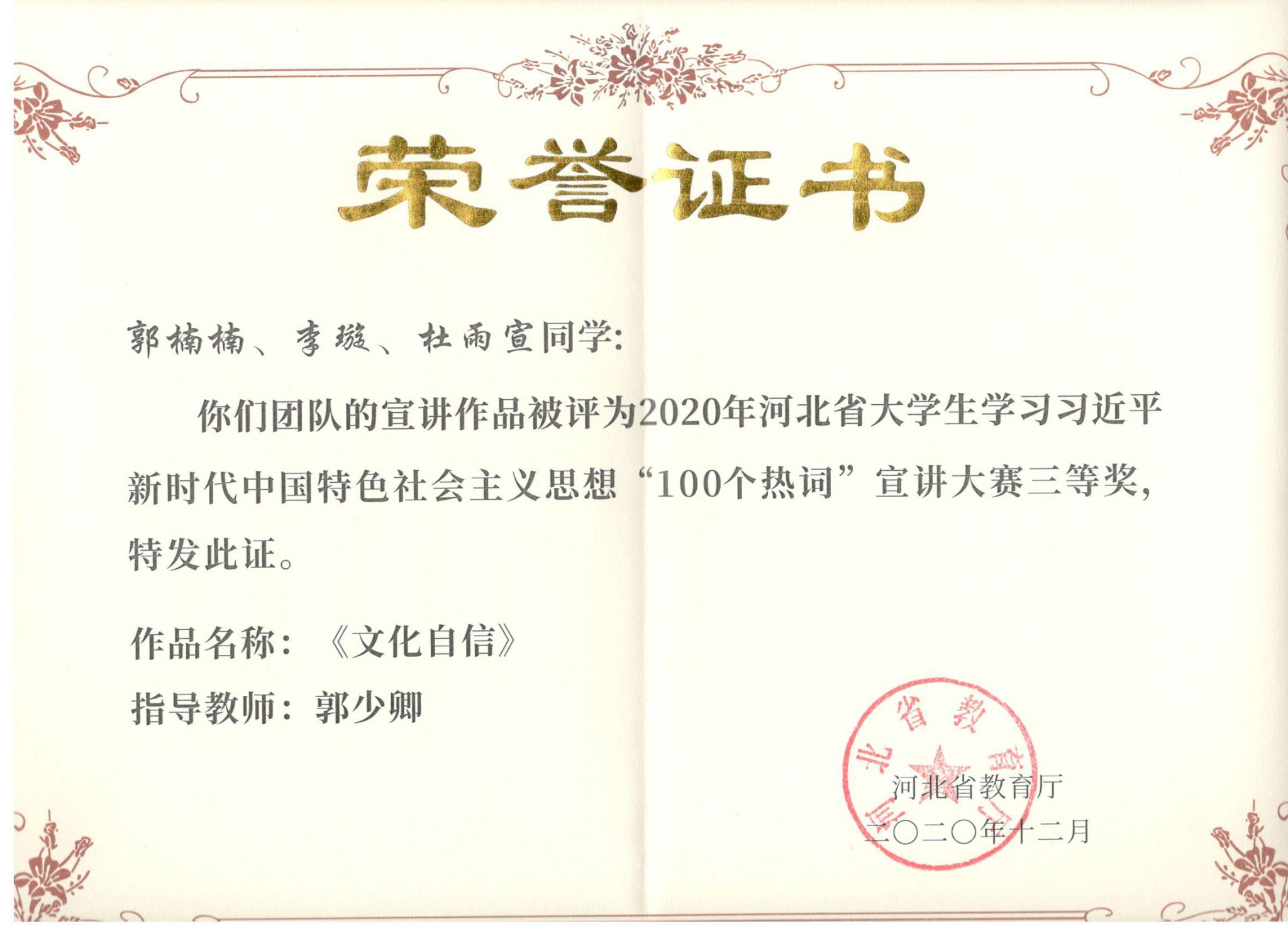 本次大赛由河北省教育厅主办。历时5个多月的时间,经过激烈角逐,马克思主义学院教师郭少卿、张伟荣获优秀指导教师奖。郭楠楠、李璇和杜雨宣同学的作品《文化自信》获得三等奖,丛睿、苗艳杰和谷雨曚同学的作品《增强四个自我》荣获三等奖。