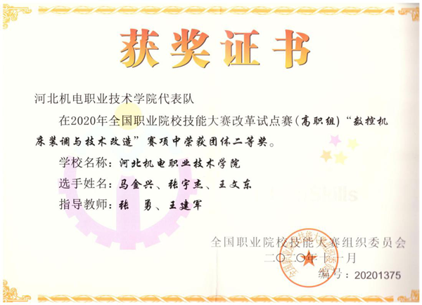 11月30日,2020年全国职业院校技能大赛改革试点赛“数控机床装调与技术改造”赛项在济南工程职业技术学院圆满落幕。本次大赛共有来自全国各地的29支代表队87名选手参赛,均为省赛第一名队伍。我院组建由张勇、王建军老师指导的竞赛团队,选派机械工程系学生马金兴、张宇杰和王文东组队参加该赛项,经过两天赛程的激烈角逐,最终获得2020年全国职业院校技能大赛改革试点赛“数控机床装调与技术改造”赛项二等奖。