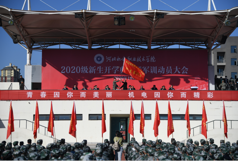 孟胜君向新生军训营授旗,2020级新生军训正式拉开帷幕。
