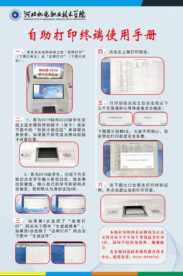 同学们使用自助打印终端时,采用校园一卡通刷卡或者学号密码输入的方式登录,系统提供成绩单、在校证明的打印,操作简单,方便快捷。学院为同学提供免费打印,每个证明每人可打印三份。打印材料的右上角印有二维码,扫描二维码可查询学生的真实成绩,确保成绩单无法伪造。