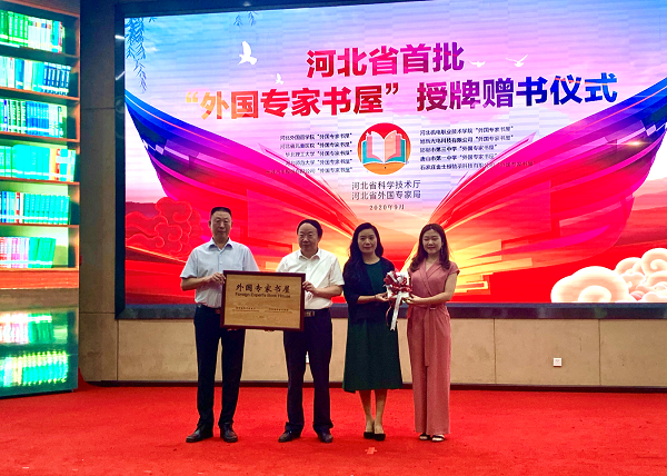 近日,我院成功获批河北省首批“外国专家书屋”。授牌赠书活动在省科技大厦举行,科技部国外人才研究中心和省科技厅领导出席活动,我院副院级领导曹振军和办公室相关人员参加授牌赠书仪式。“外国专家书屋”是国家科技部国外人才研究中心组织的一项服务引进外国专家项目,以提升外国专家的归属感和幸福感。