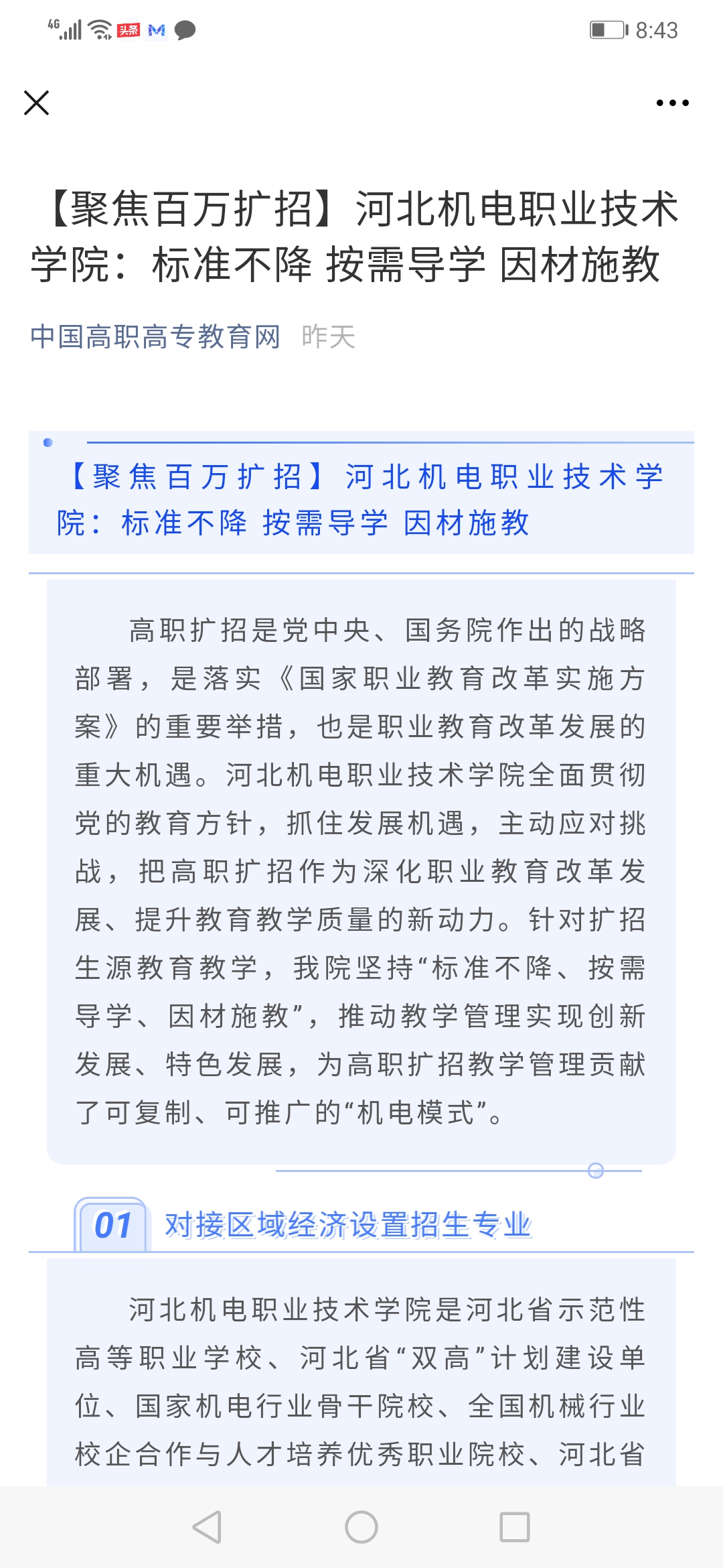 我院高职扩招经验做法《标准不降 按需导学 因材施教》,经河北省教育厅推荐,通过教育部组织的专家遴选,入围全国高职扩招47个典型经验案例,在中国高职高专教育网上以专栏形式刊登。
