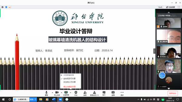 为了保证本科毕业答辩工作顺利进行,学院成立了邢台学院机电工程学院毕业设计答辩委员会及答辩工作小组,制订了详尽周密的答辩方案。答辩前,系部多次召集毕业生开展线上答辩协调会,传达毕业设计相关文件要求,对论文查重、外审、毕业设计交叉评阅等工作进行周密部署,同时对本科毕业设计质量、毕业设计评定程序进行严格把关。