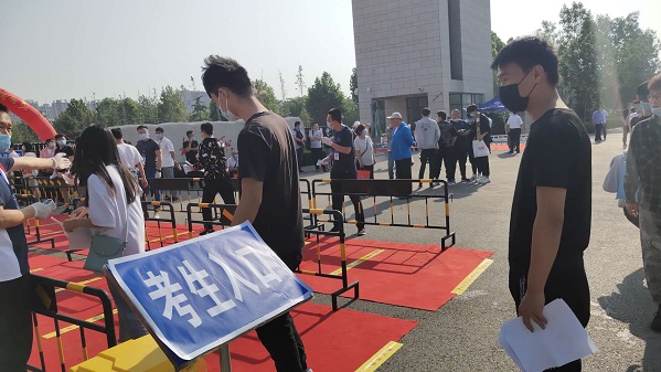 考生在考场外排队,再次测温有序进入考场