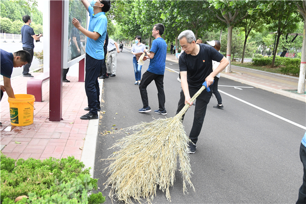 在院领导的带领下,全体党员和志愿者顶着炎炎烈日,挽起袖子加油干,对学院南门口从钢铁路到太行路道路,以及道路周边的垃圾箱、交通护栏、展牌、健身器材、公交站牌等公共设施进行了认真清洗和擦拭,使街道面貌焕然一新。