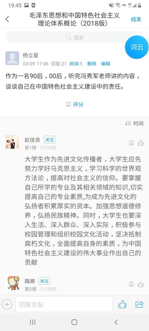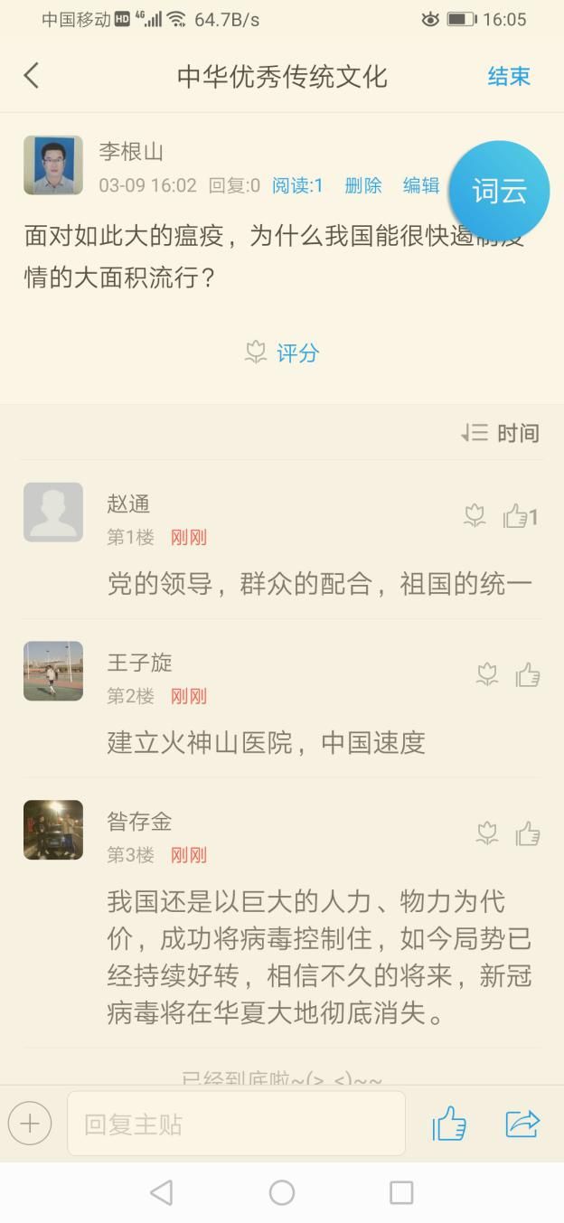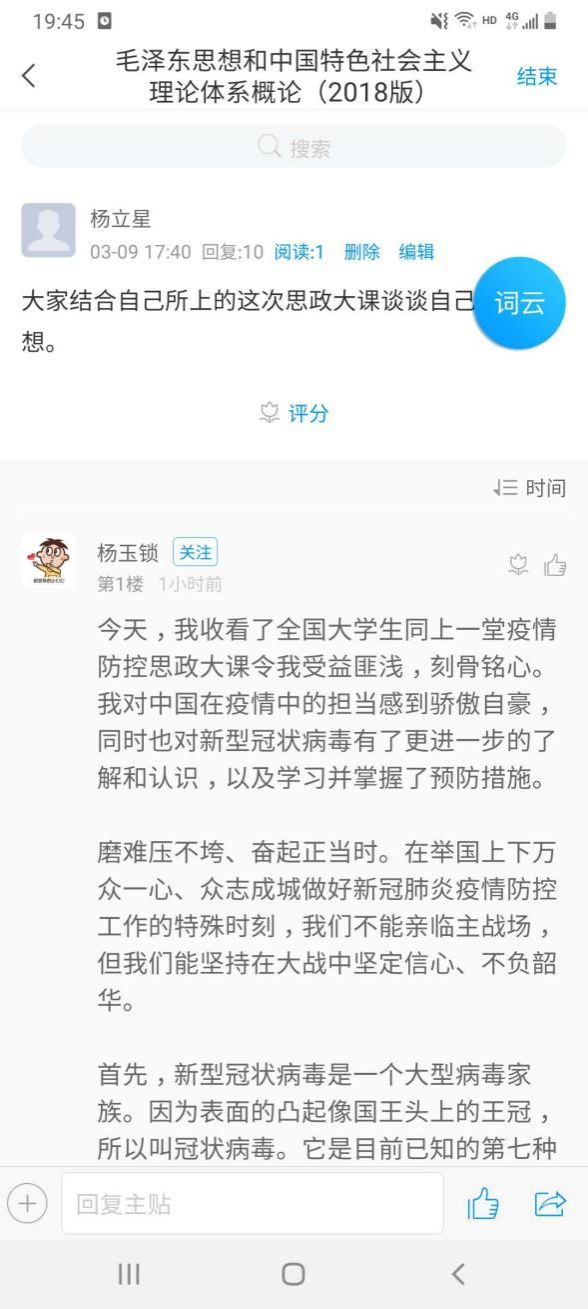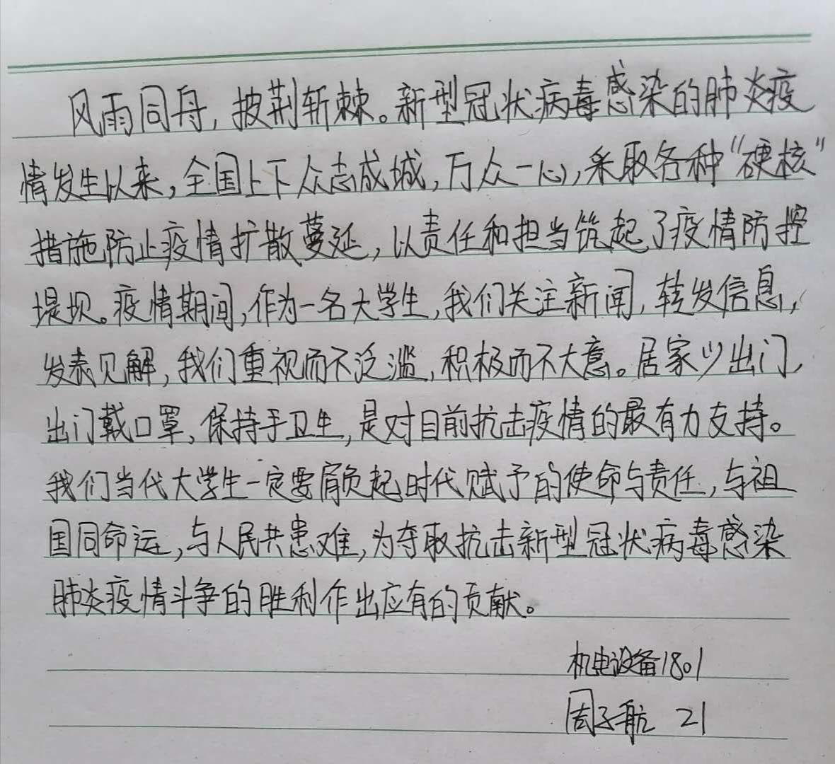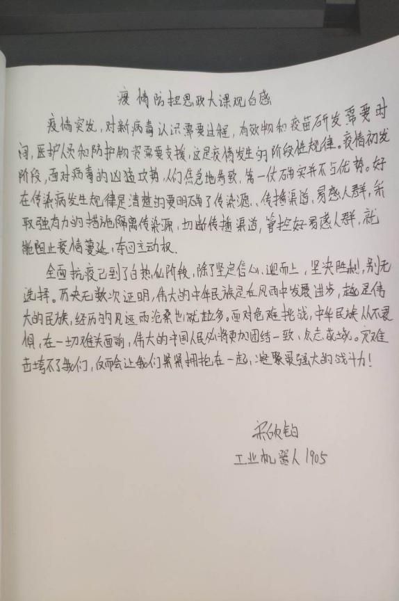 同学们纷纷表示本次中国抗疫斗争彰显了中国共产党的领导和中国特色社会主义制度的显著优势,凸显了负责任大国的形象。在党中央坚强领导下,广大党员干部舍身忘我拼搏,全体中华儿女共同奋斗迎来了抗疫斗争的阶段性成就。大家决心坚决响应党委政府号召,一方面结合自身实际,抓好个人防护,保证把停课不停学落到实处,上好网络在线课程。更重要的是扎根中国大地,不辜负建功立业的人生际遇,不辜负“天将降大任于斯人”的时代使命,不辜负党的期望、人民期待、民族重托,努力做有理想、有本领、有担当的时代新人。