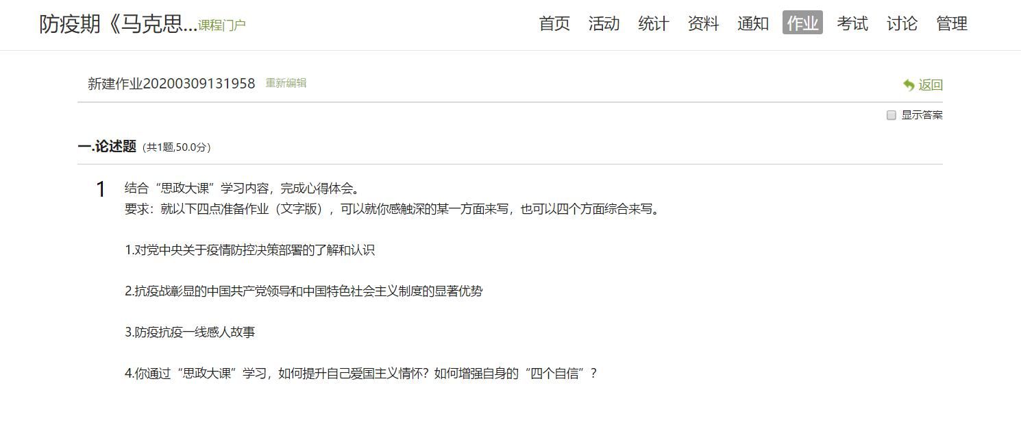 马克思主义学院领导多次强调此次课程的重要性,将本次“思政大课”列入疫情防控期间思政课教学的统一安排,通知认任课教师组织学生按时上课,因课程冲突无法参加在线直播学习,要及时组织学生回看教学视频,结合本次“思政大课”情况,组织学生在线讨论,并将组织情况形成文字材料报部门保存。
