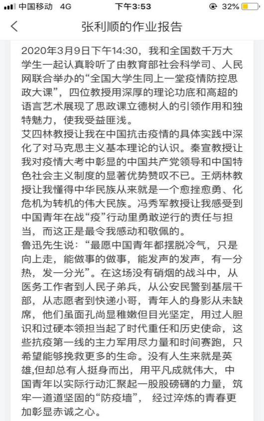 教务处认真部署落实,安排好学生在线听课的相关工作。在145名学生管理人员的有序组织下,共有9919名学生观看思政大课,学生们反响热烈。学院各系部学生在20名思政课教师的组织下以班为单位利用学习通、腾讯视频、微信群、QQ群等平台对这次特殊时期特殊形式的思政课展开了热烈的讨论。