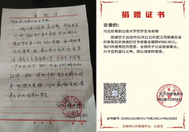 疫情面前,机电学子敢担当、勇作为,默默付出,不求回报。志愿服务从来不是一种冲动,它是“党有号召团有行动”的一种生动实践。有时间做志愿者,有困难找志愿者,他们用实际行动践行着“我为人人,人人为我”的雷锋精神,也成为青年学生的生活态度。他们在这场疫情防控阻击战中的突出表现得到了当地政府、医疗组织、社区、村委会的表扬。