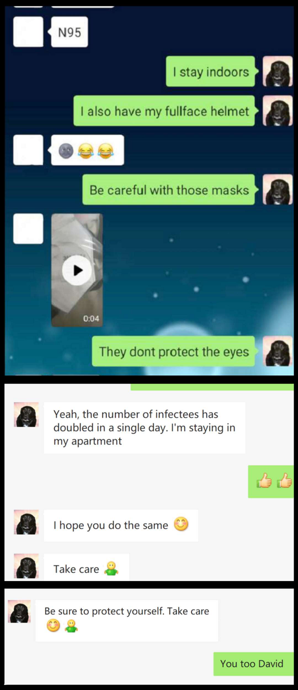 几年前,大卫在英国经历过禽流感大爆发,学会了如何用科学的方法保护自己。他利用社交软件把自己的知识和经验传授给身边的朋友和同事,每天互报平安。