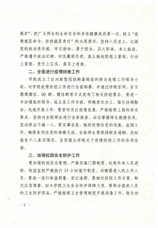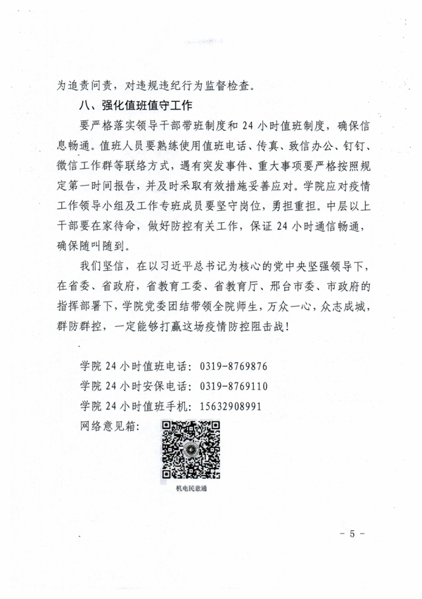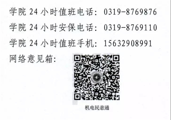 学院党委高度重视应对新型冠状病毒疫情防控工作,坚决落实省委、省政府,省委教育工委、省教育厅,市委、市政府的安排部署。让我们坚定信心,同舟共济,共同打好这场疫情防控的“全民战争”,共同维护好河北机电这个阵地的安全,为全面夺取疫情防控阻击战胜利做出我们河北机电人应有的贡献!