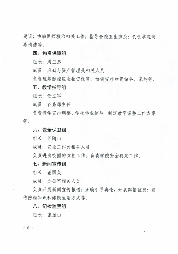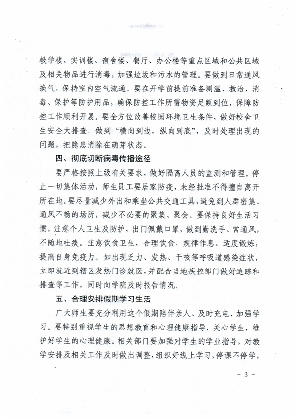 张晓辉强调,一要统一思想、迅速行动,把疫情防控作为目前首要政治任务,充分认识当前疫情防控的严峻形势,严格按照上级和学院有关要求,部署落实各项防控措施,坚决遏制疫情传播;二要严守政治纪律政治规矩,坚决做到不造谣、不传谣、不信谣,坚决做到守土有责、守土负责、守土尽责,踏踏实实地做好自己的工作;三是未雨绸缪,抓紧制定学院相关防控制度,保证物资,确保学生开学前后各种防控措施能够落实到位;四是要落实假期工作制度,中层领导在家随时待命,做好防控准备,确保24小时通讯畅通,做到随叫随到。