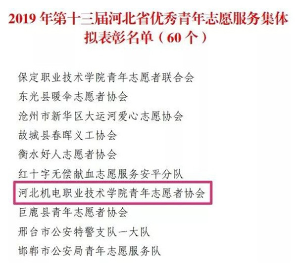 近日,第十三届河北省青年志愿服务评选表彰活动落下帷幕,我院青年志愿者协会喜获2019年第十三届河北省优秀青年志愿服务集体表彰。