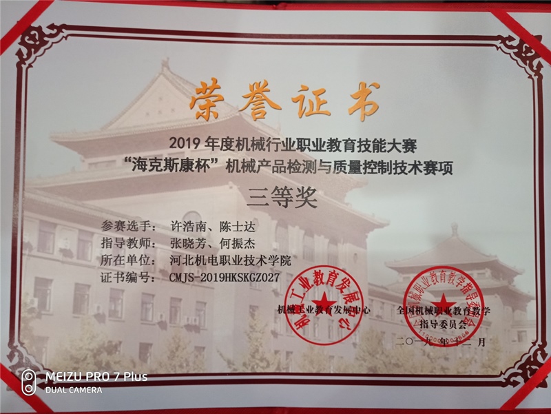 12月20日,由机械工业教育发展中心和全国机械职业教育教学指导委员会主办,机械行业智能检测技术职业教育集团和九江职业技术学院承办的2019年度机械行业职业教育技能大赛“海克斯康杯”——机械产品检测与质量控制技术赛项顺利结束。这是检测领域赛事首次进入机械行业全国大赛,吸引了来自全国22个省市自治区,42所院校54个参赛队共计108位选手同台竞技。我院机械工程系机械制造与自动化专业学生许浩南、陈士达在本次大赛中脱颖而出,喜获三等奖。