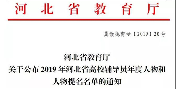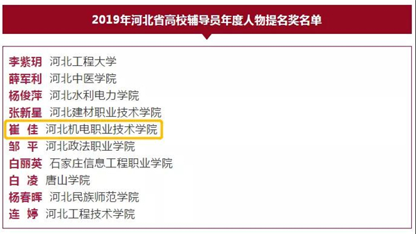近日,由河北省教育厅开展的2019年河北省“高校辅导员年度人物”评选活动结果揭晓,我院财会与管理工程系辅导员崔佳荣获2019年河北省高校辅导员年度人物提名奖。