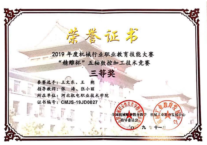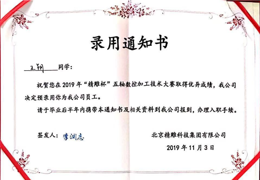 2019年11月初,工程创新班学生王朔和王文东参加2019年度机械行业职业教育技能大赛——“精雕杯”五轴数控加工技术大赛。这是我院第一次派选手参加多轴加工技能大赛,两名学生在北京精雕有限公司培训期间,紧紧抓住机会,不懂就查,不懂就问,熟练掌握了多轴加工的软件编程与多轴机床加工操作,并能使加工零件精度达到μm级,最终获得全国三等奖,并被北京精雕有限公司录用。