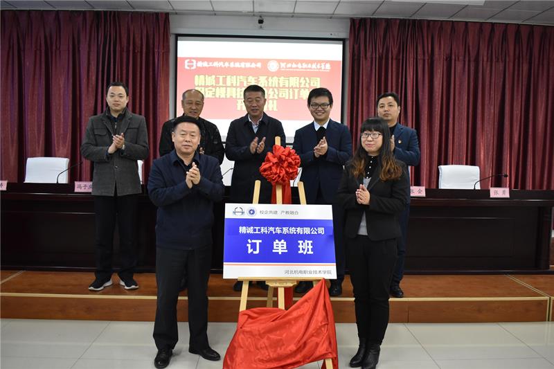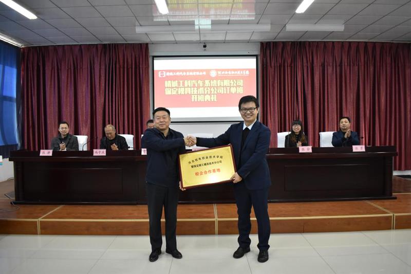 在校企双方领导、教师和订单班全体学生的共同见证下,王振京和张会代表校企双方为精工模具订单班揭牌。