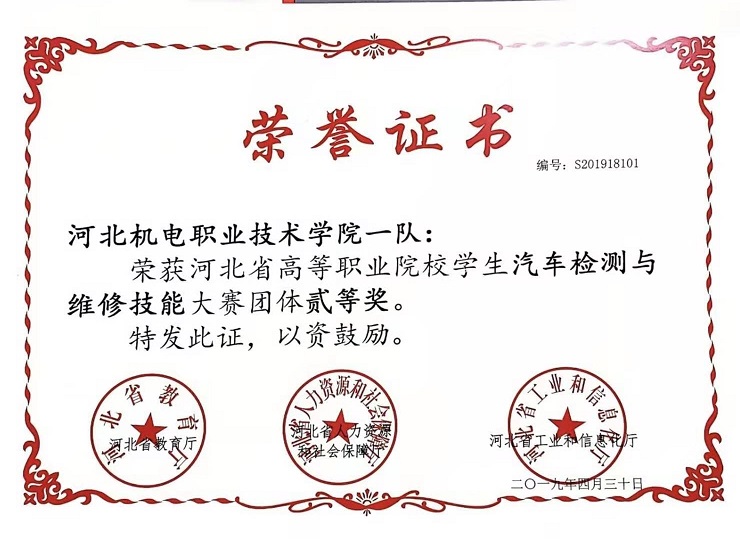 4月12、13日,由河北省教育厅、财政厅、人力资源和社会保障厅、工业和信息化厅主办,河北省汽车职业教育集团承办的“2019河北省职业院校技能大赛—高职汽车检测与维修”赛项在邢台职业技术学院举办,我院汽车系派出由李文涛老师带队、王菲老师担任指导老师,滕啸、孟祥宇、刘润、马玉伟、孙瑞、赵京东6名同学组成的代表队参加本次比赛。经过两天的激烈角逐,我院学子最终在大赛中荣获团体二等奖。