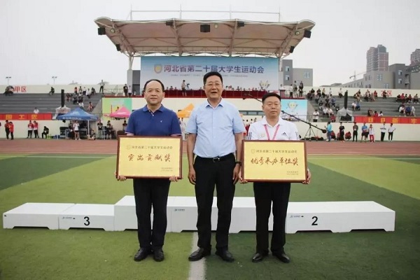 马志雁宣布《河北省教育厅授奖决定》,授予我院“河北省第二十届大学生运动会优秀承办单位奖”,授予邢台学院“河北省第二十届大学生运动会突出贡献奖”。王廷山为我院与邢台学院颁奖。
