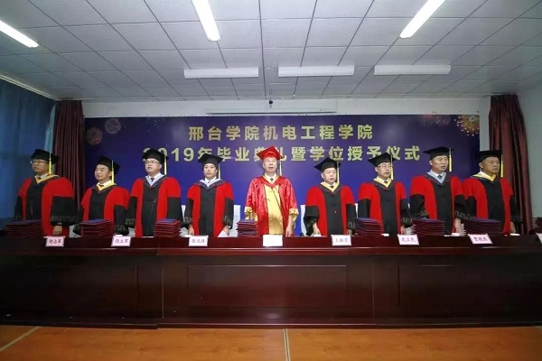 毕业典礼在庄严的国歌声中拉开帷幕。我院教务处处长任立军宣布2019年毕业生毕业、结业情况;邢台学院机电工程学院学位评定分委员会主席胡占军宣读《2019届本科毕业生学士学位授予决定》;招生就业处处长贾晓东宣读《关于表彰2019届学院优秀毕业生的决定》。