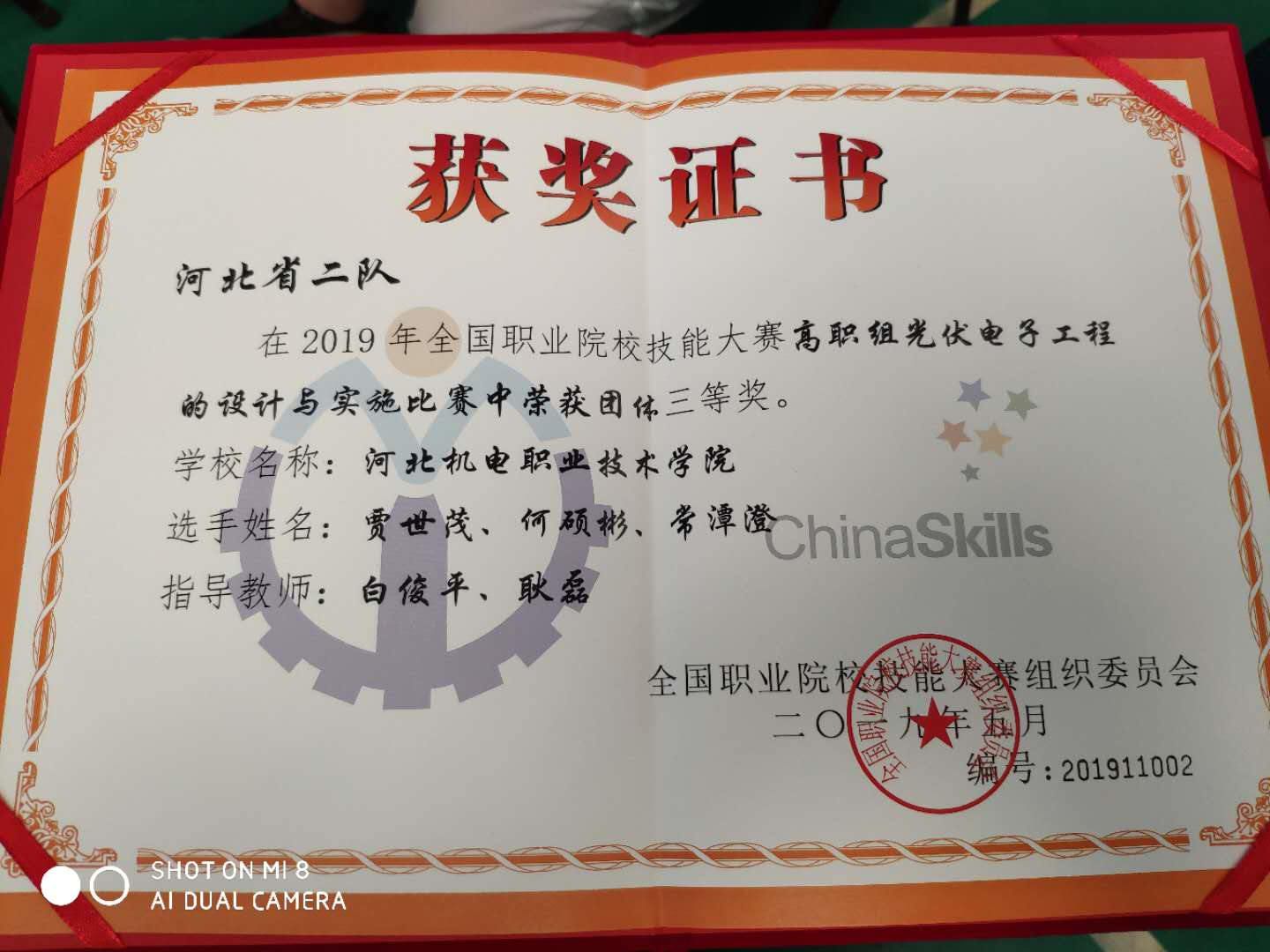 我院高度重视技能竞赛工作,从组织、制度、经费等方面建立健全了竞赛保障机制,鼓励广大师生积极参加各类职业技能竞赛活动,不断提高竞赛质量和水平。在学院领导的大力支持下,电气工程系指导教师白俊平和耿磊为参赛选手制订了详细的备赛计划;参赛选手全力以赴,勤学苦练,保证了训练计划顺利跟进实施。在河北省职业技能大赛的备赛过程中,参赛小组克服备赛时间短、备赛难度大等困难,取得了河北省职业技能大赛第一名,并代表河北省参加2019年全国职业技能大赛。自接到比赛任务开始,参赛选手们就在老师的精心指导下反复训练,甚至在去往比赛场地的火车上也潜心贯注地练习。在6月3日当天历时5个小时的比赛过程中,三位选手沉着应赛、冷静发挥,最终获得本赛项的三等奖。