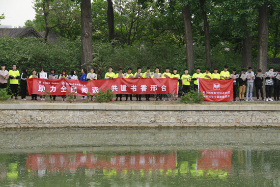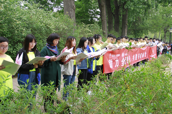 我院图书馆馆长刘为民、图书馆学生社团负责人刘全芹带领70余名同学参加了此次诵读活动。同学们高举印有学院标志的大型条幅及社团旗帜,在达活泉湖畔充满激情地诵读了朱自清的《春》,以及《大学》节选、《春江花月夜》《岳阳楼记》《水调歌头•重上井冈山》《将进酒》等知名篇目。诵读活动历时2个小时,同学们意犹未尽,纷纷表示回去后要多读书,读好书,做到腹有诗书气自华。