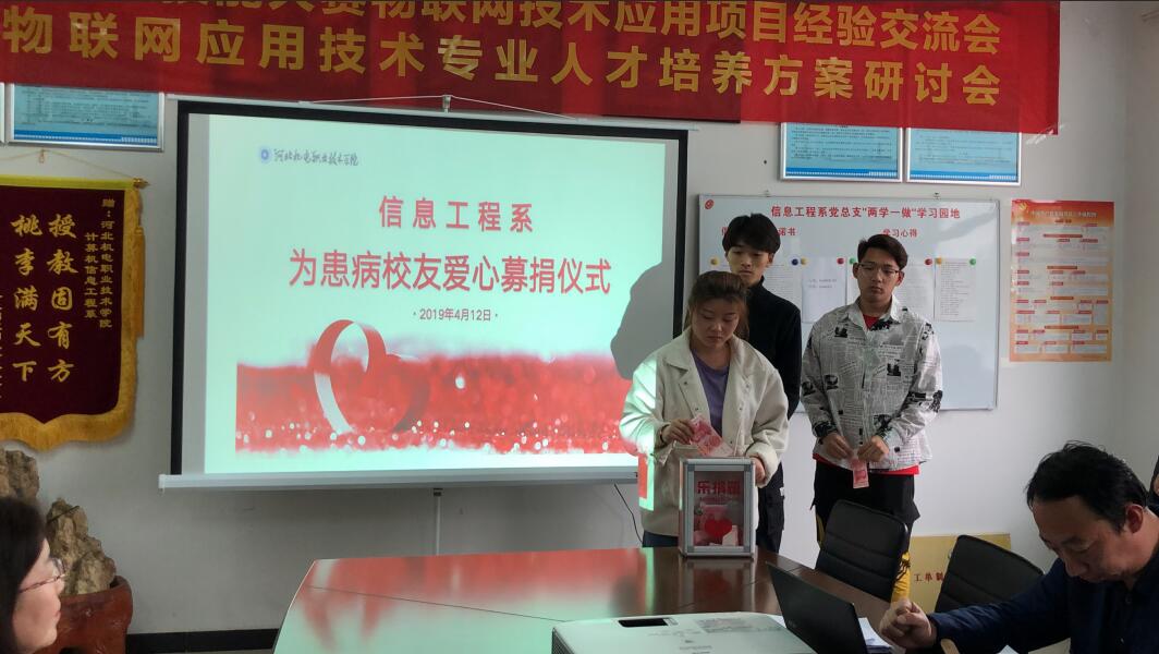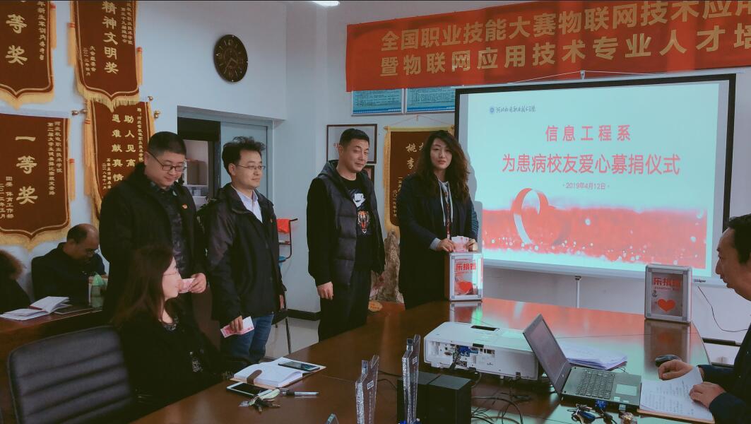4月12日下午,信息工程系党总支在7号实训楼206会议室组织全体师生为刘晓冉献爱心。党总支书记籍宇向到场师生介绍了刘晓冉目前的病情及治疗情况,并发起爱心募捐倡议。全体师生积极响应,纷纷奉献自己的一份力量,不能来到现场参与募捐的老师和同学们,也纷纷通过微信转账或代捐等形式,献出自己的爱心。