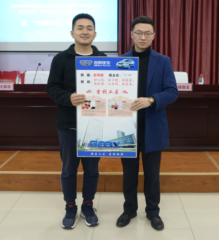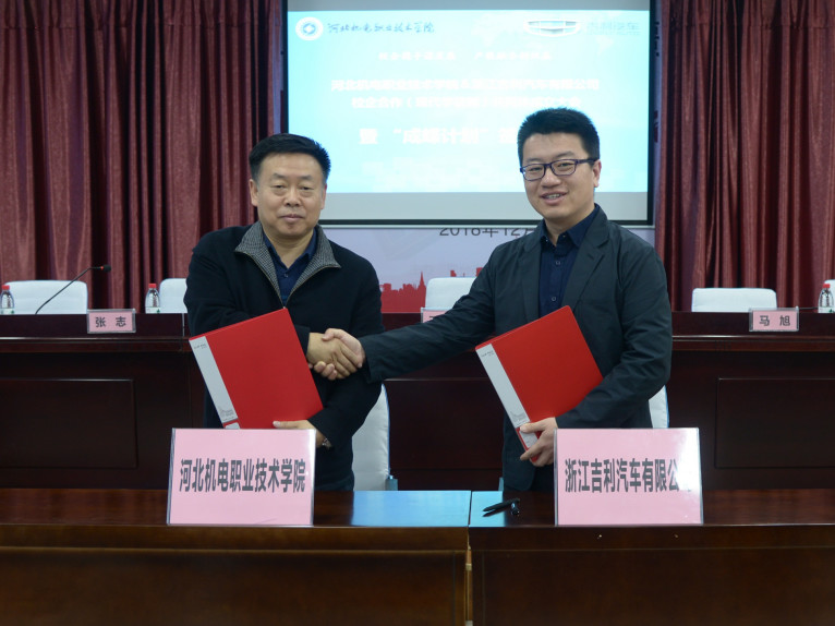 3月22日,我院与浙江吉利汽车有限公司在至善楼105会议室举办校企合作共同体成立大会暨“成蝶计划”签约仪式。学院副院长王振京,汽车工程系书记耿晓东、主任张志、副主任张国新,浙江吉利汽车有限公司张家口工厂人力资源部经理王利东,浙江吉利控股集团人力资源中心东北区招聘经理马旭,浙江吉利汽车有限公司销售公司冀南大区营销经理陈鲁玉,汽车工程系教师及吉利汽车订单班学生代表参加大会。签约仪式由汽车工程系主任张志主持。