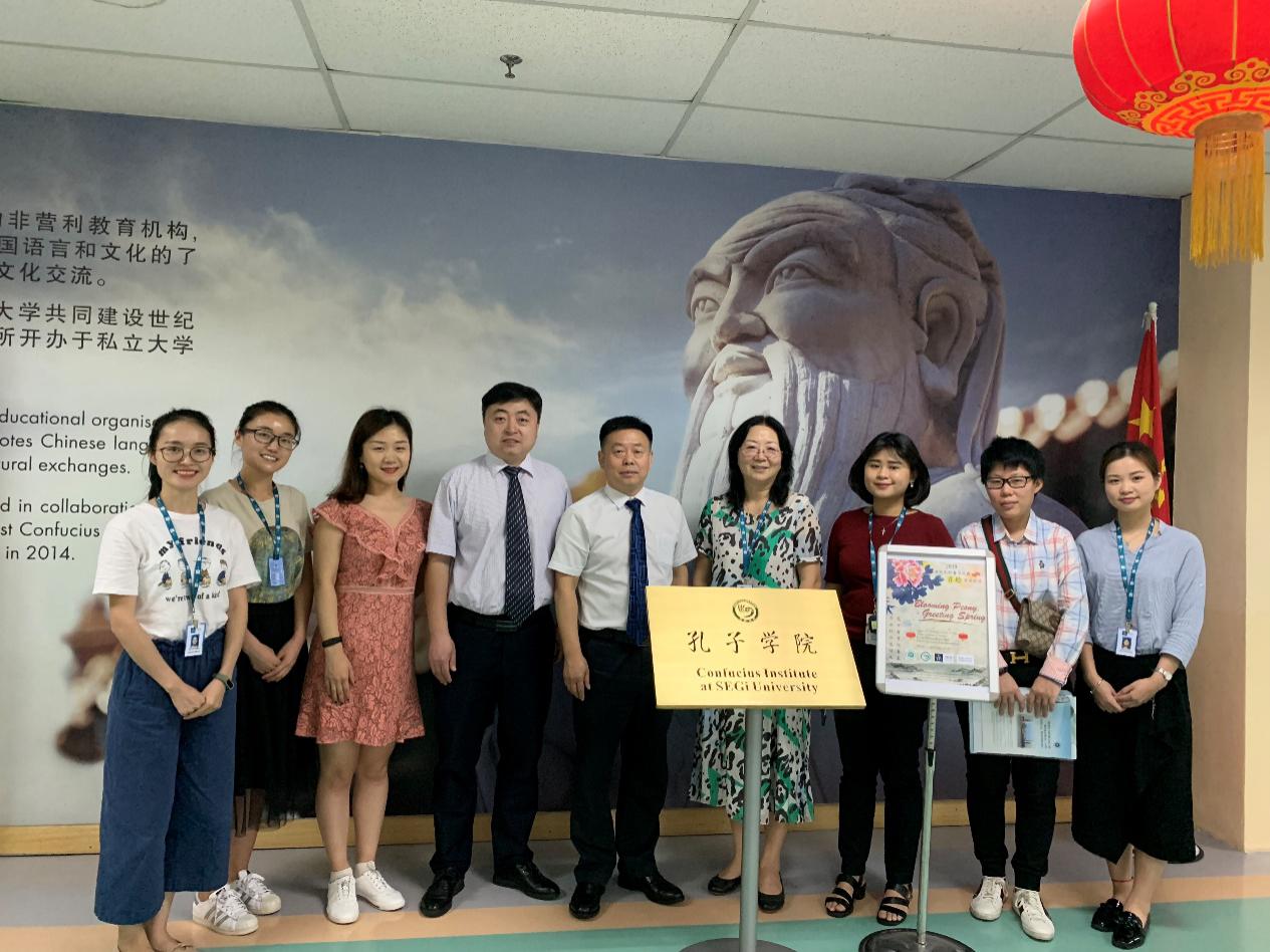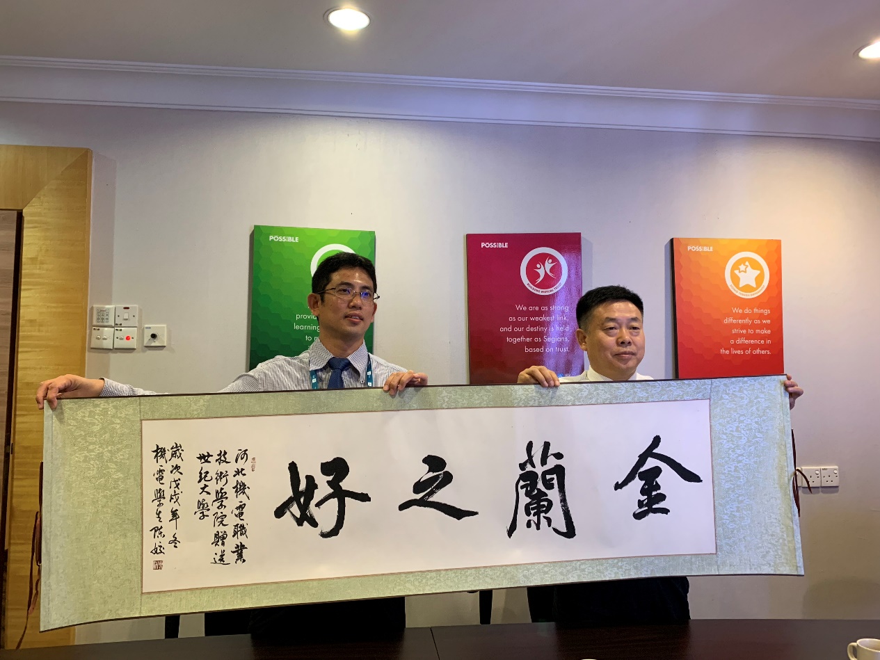 王振京同世纪大学国际部主任王志文共同商讨了我院与世纪大学国际合作模式,签订了框架协议,就我院学生到世纪大学读本读硕、教师读博、留学生双联课程、短期培训和文化交流等合作项目达成共识。王振京一行参观了世纪大学的教学楼、图书馆、孔子学院等处,双方互赠礼品,世纪大学还接受了由我院学生书写的象征两校友谊的“金兰之好”书法作品。