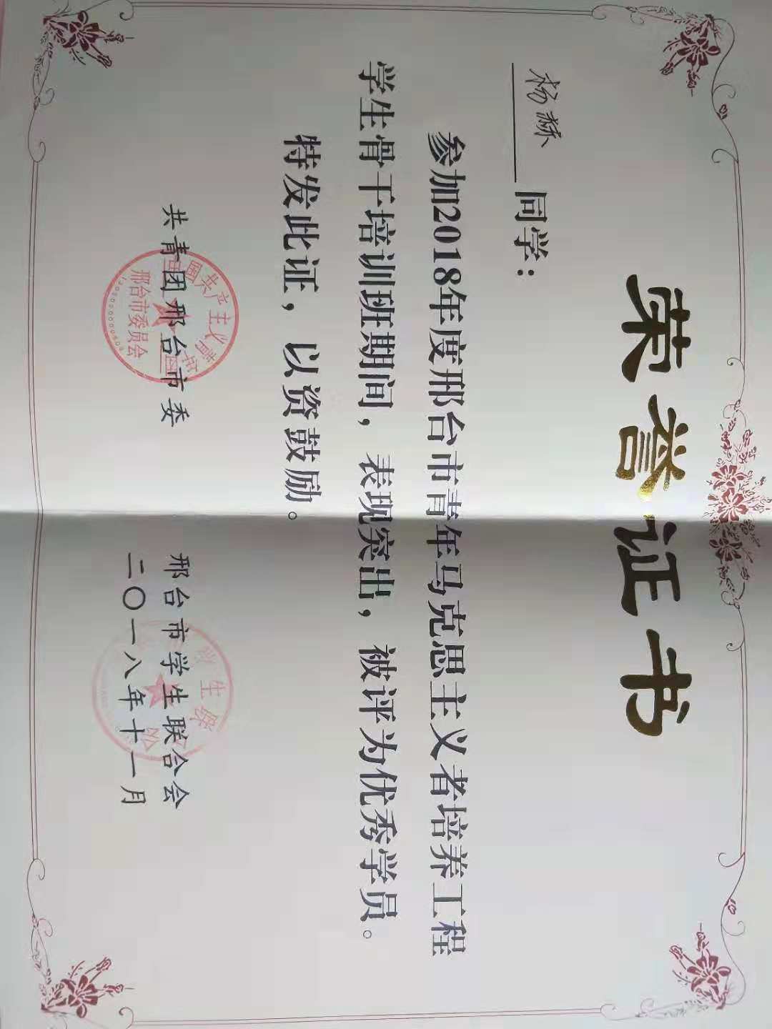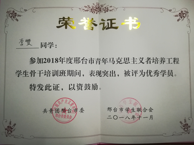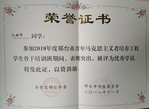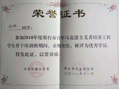 11月14日,根据邢台团市委、市学联《关于举办2018年度邢台市青年马克思主义者培养工程培训班的通知》要求,我院派出三十名学生代表参加了在邢台职业技术学院图书馆报告厅举行的培训。