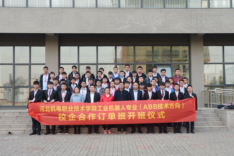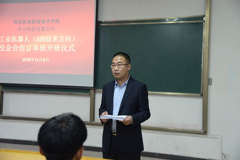 11月8日下午,我院与石家庄中川科技有限公司签订的ABB技术方向订单班开班仪式在新民楼102隆重举行。石家庄中川科技有限公司总经理于长水、电气工程系主任方红彬、2018级辅导员王贵丽、企业驻校老师郝一飞以及订单班全体同学参加仪式。