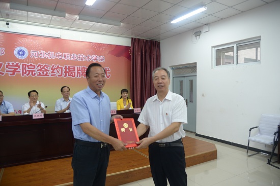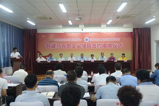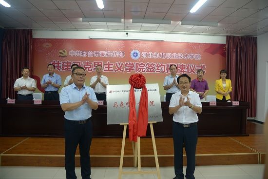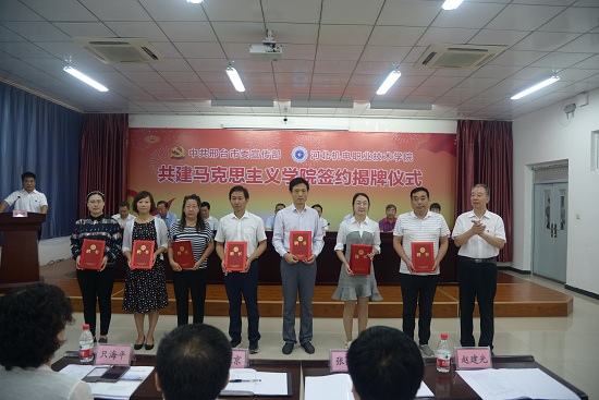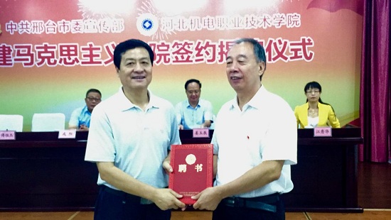 9月15日上午,我院与邢台市委宣传部共建马克思主义学院签约揭牌仪式在C座105会议室举行,标志着我院成为河北省第一所与地方宣传部门共建马克思主义学院的高职院校。中共邢台市委常委、宣传部长戎阳,市委宣传部常务副部长姜玉辰、市委宣传部副部长刘英民,华中师范大学马克思主义学院原院长、教授、博士生导师秦在东,内邱县岗底村党总支书记、主任杨双牛,河北省社会科学院理论研究所所长李鉴修,兰州石化职业技术学院马克思主义学院书记江秀华,河北机电职业技术学院党委书记张晓辉,院长傅恒杰,副院长赵国增、王振京、张兆隆以及市委宣传部、学院科级以上干部、辅导员、思想政治部专兼职教师、学生代表参加了签约仪式。仪式由赵国增主持。