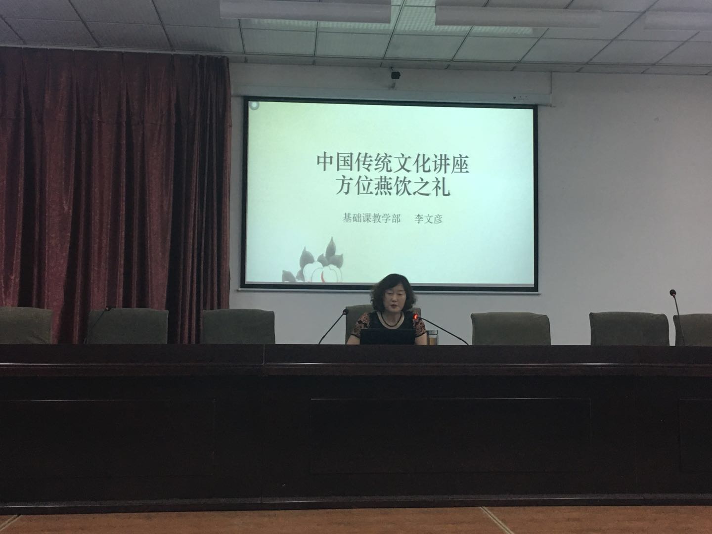 本次讲座由语文教研室李文彦老师以《中国传统文化——方位燕饮之礼》为题,向同学们讲述了中国古代的方位与燕饮文化,内容丰富、引经据典。李文彦老师从燕饮的方位、基本原则、序态、宾主关系、旅酬几个方面详细地介绍了古代燕饮时的礼仪,并以有趣的历史故事为引入,增加了讲座的趣味性。最后,李老师又向学生们简单地介绍了现代宴会礼仪和用餐禁忌。