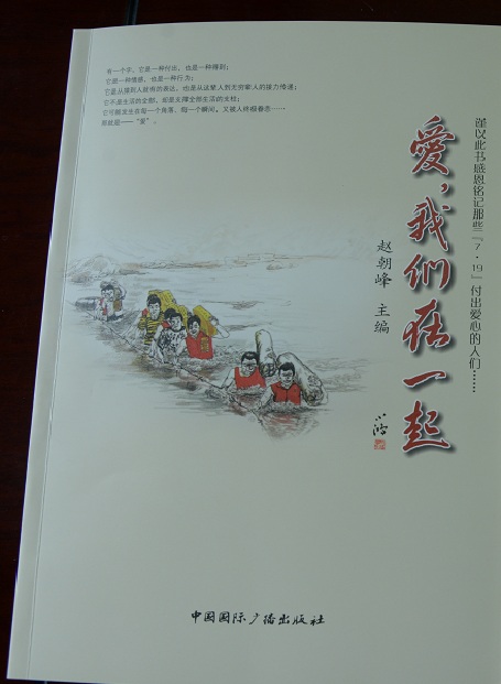 《爱,我们在一起》是由赵朝峰主编,中国国际广播出版社出版。此书生动记述了“7.19”抗洪救灾中邢台市各行各业、解放军官兵、爱心人士和公益组织可歌可泣的故事,收录了“7.19”抗洪救灾中惊心动魄的珍贵图片。此书不仅宣传了抗洪精神,还传播了爱心公益的力量,弘扬了主旋律,传递了正能量,更重要的是把爱的力量进行了延续。