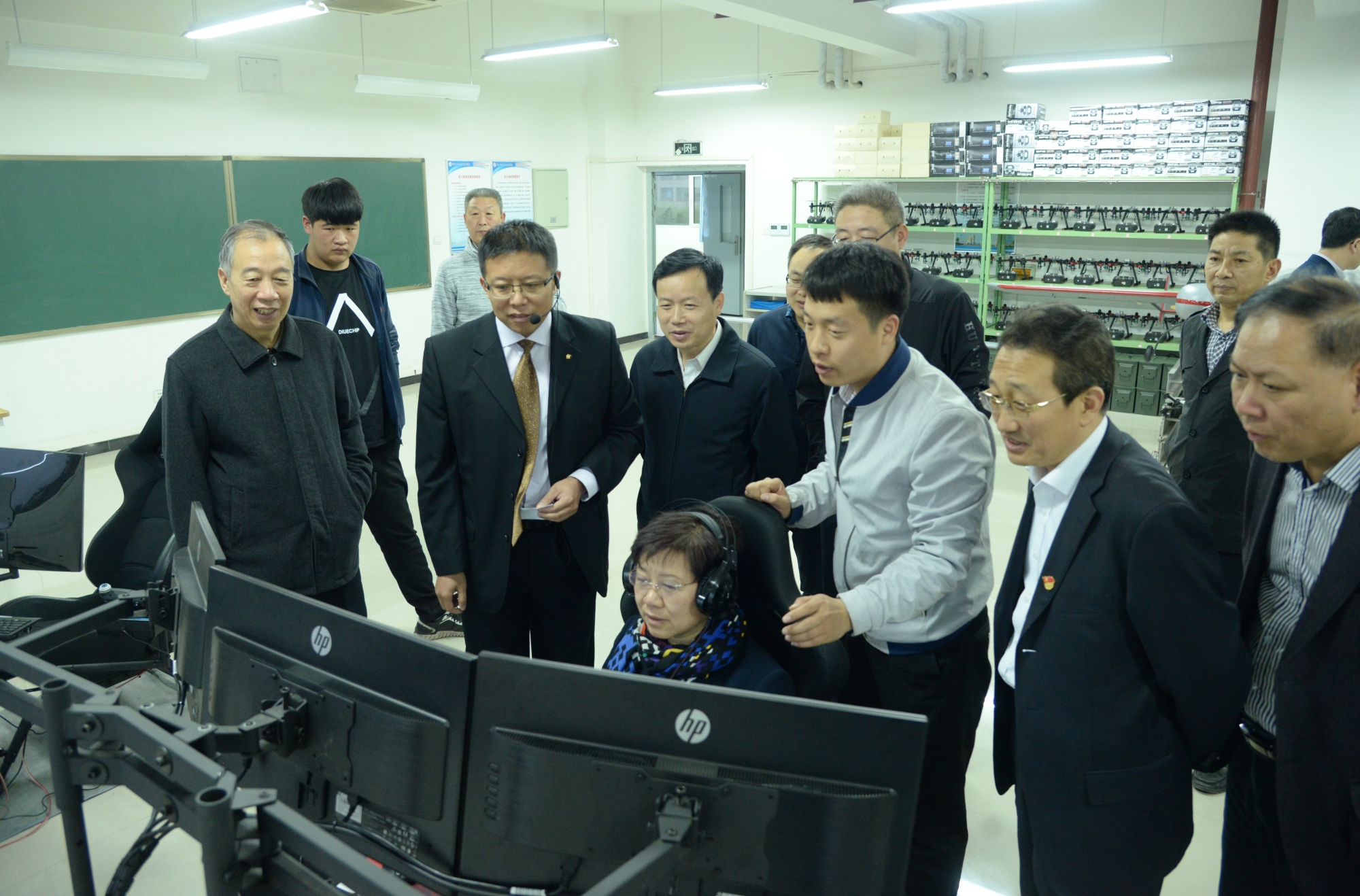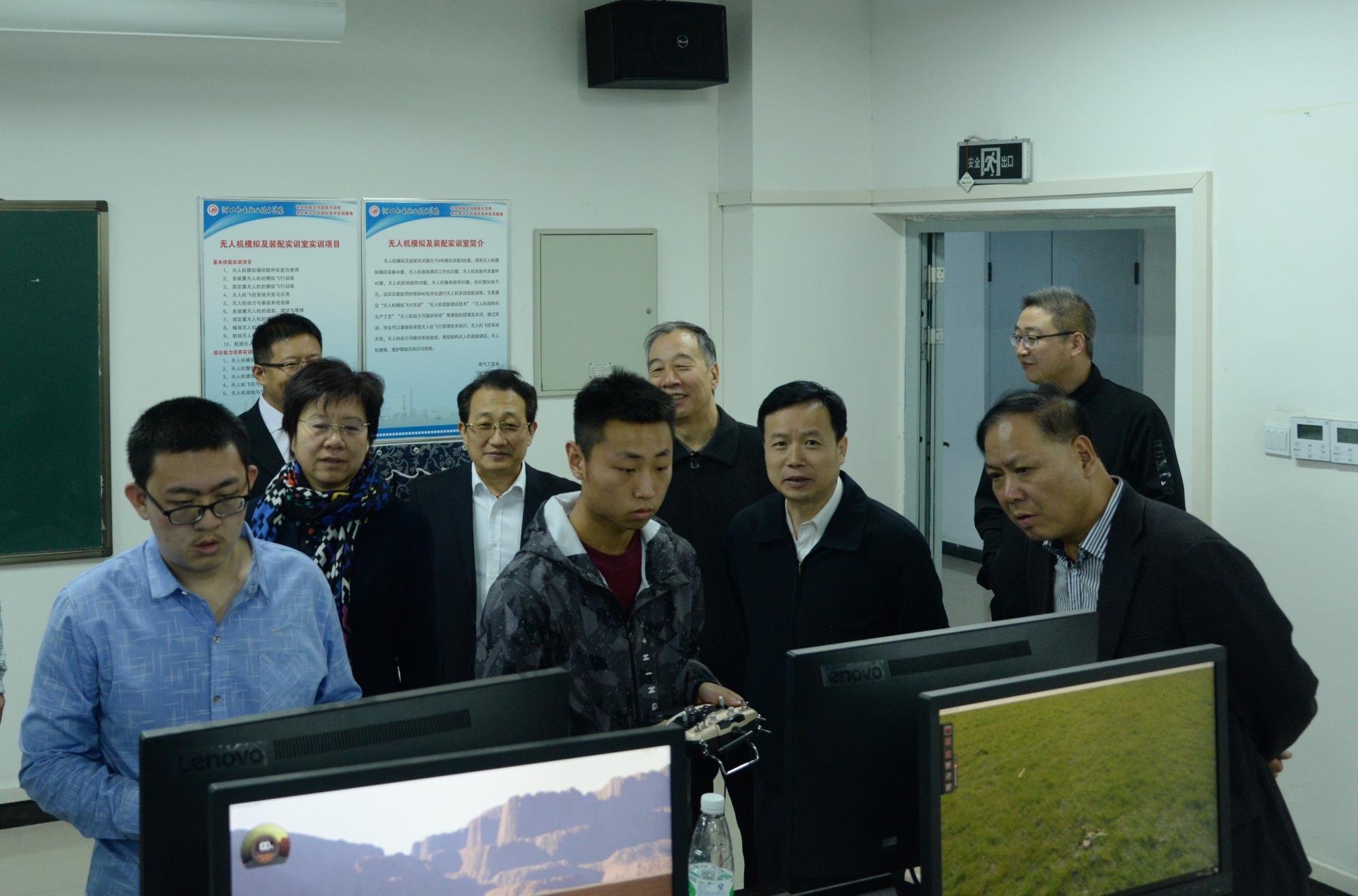 在无人机应用技术专业模拟及装配操控实训室,邓副市长饶有兴趣地操控模拟飞行器。