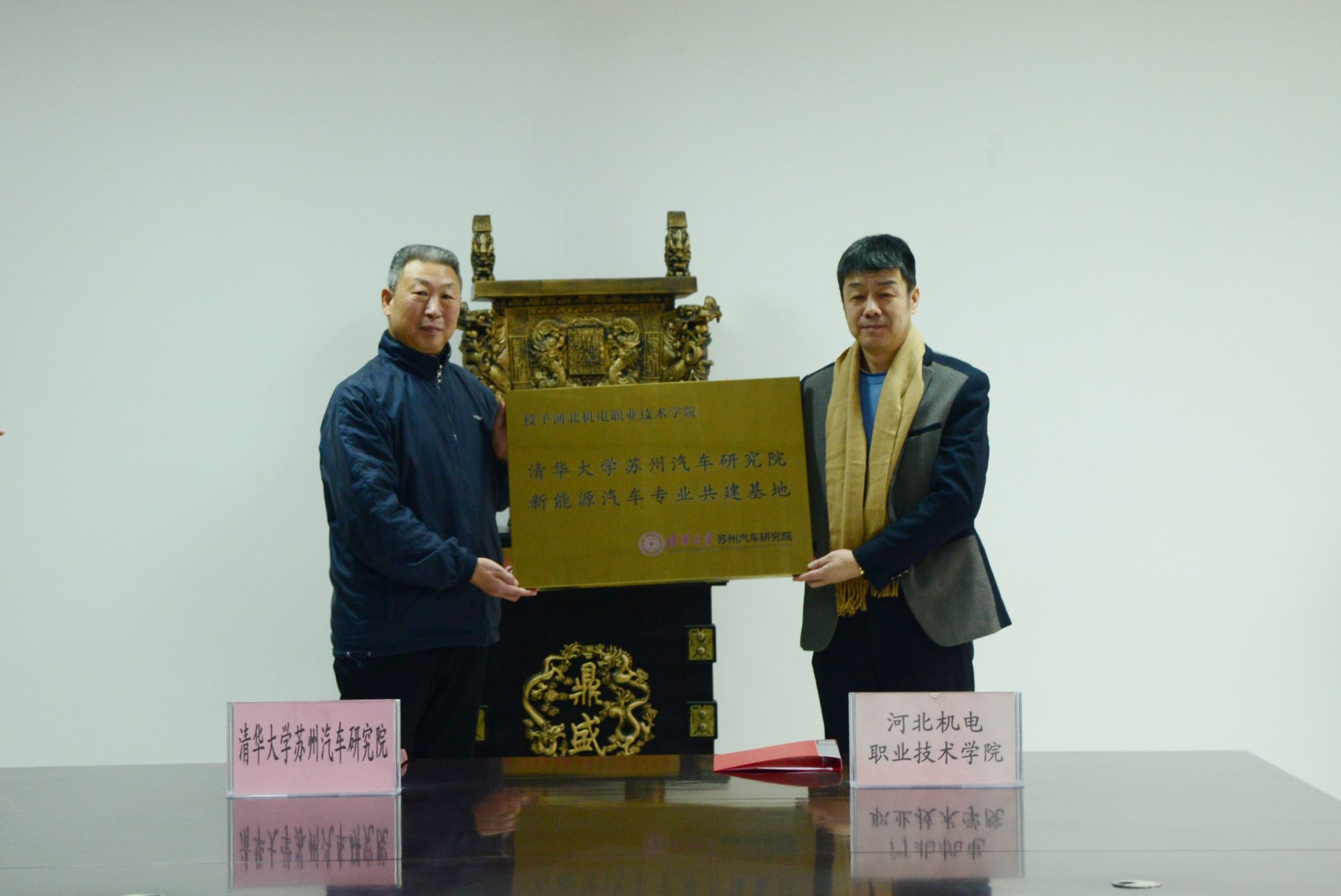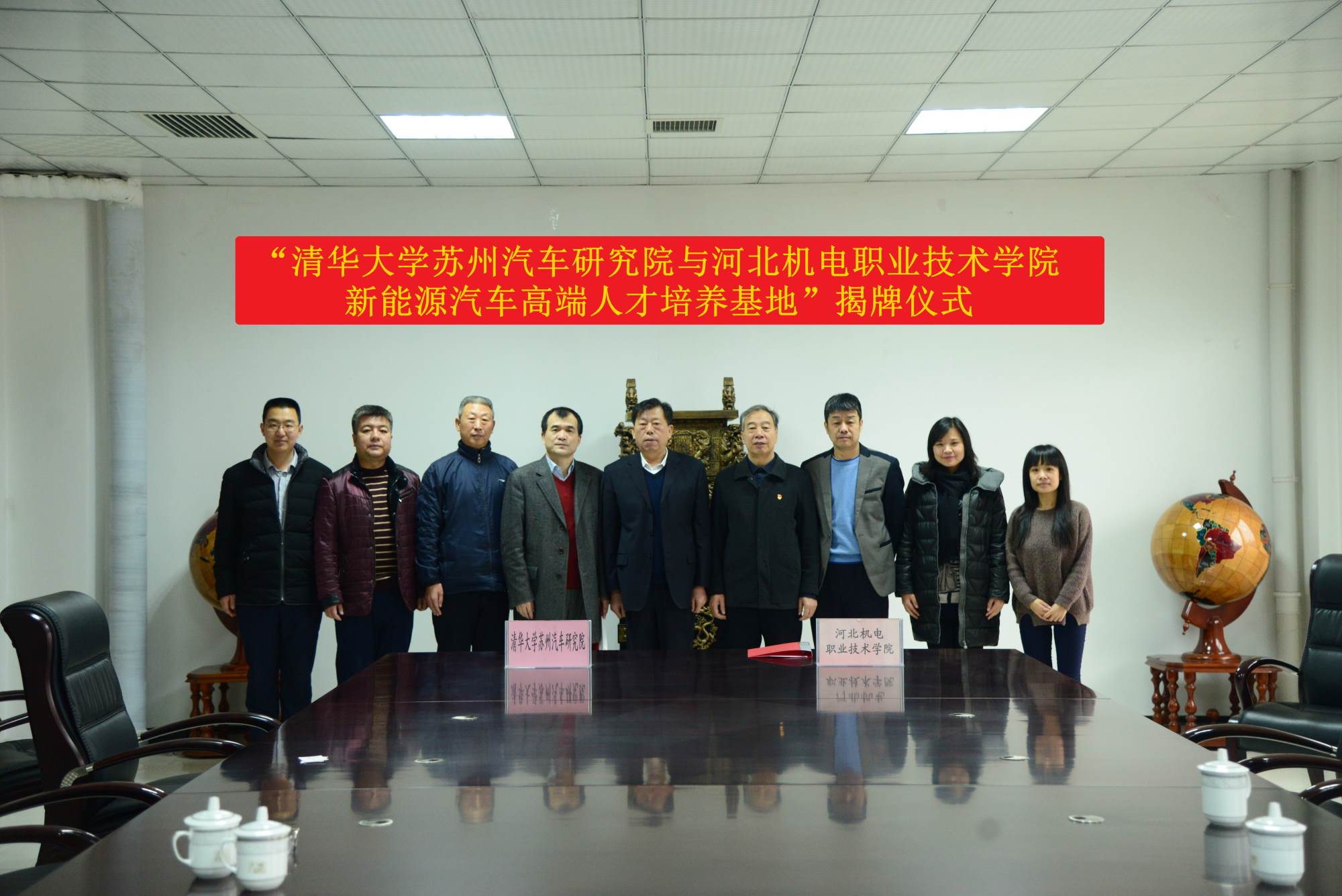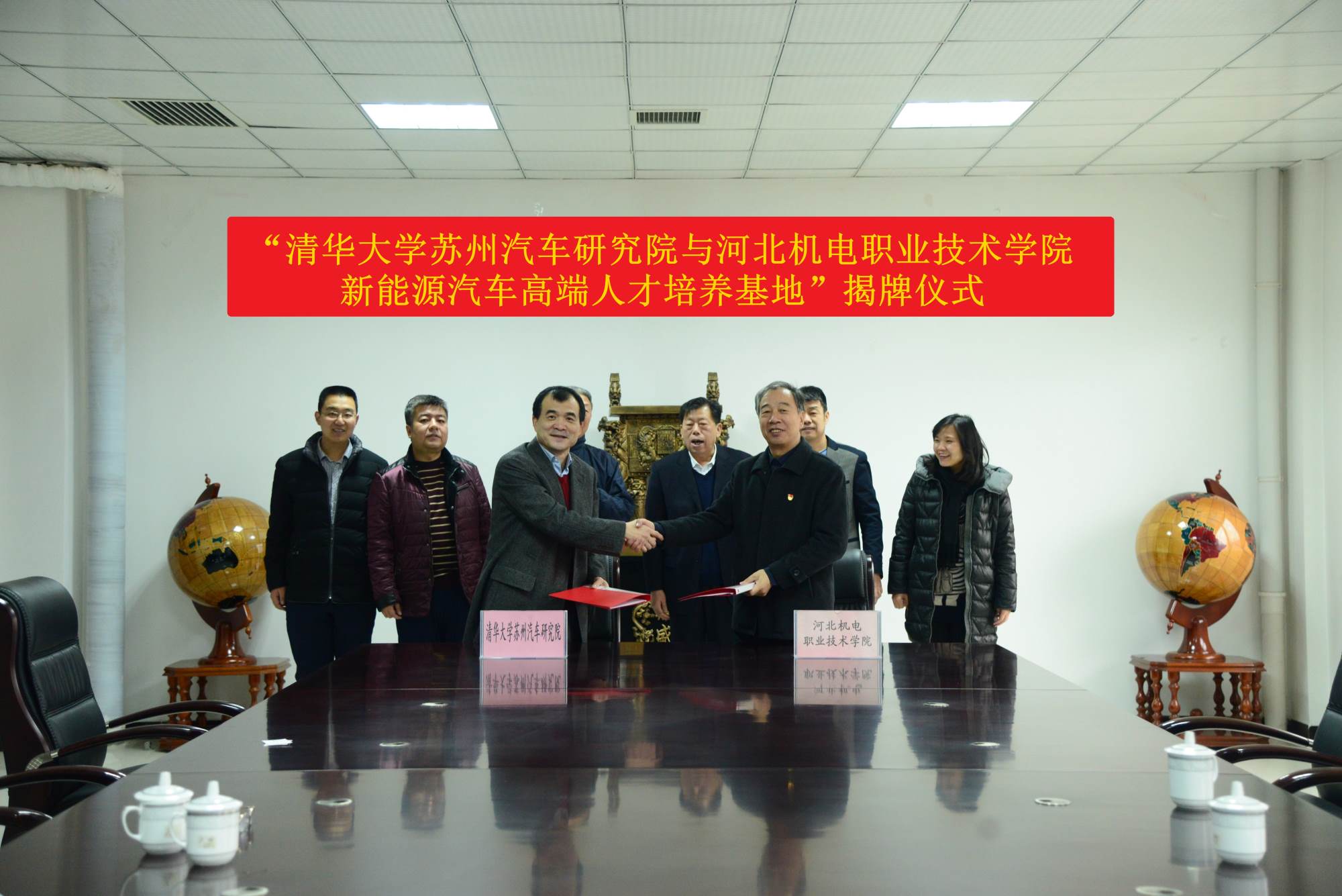 2018年1月22日,学院举行了“清华大学苏州汽车研究院与河北机电职业技术学院新能源汽车高端人才培养基地”揭牌仪式。学院党委书记菅新月、院长傅恒杰、副院长曹振军、汽车工程系主任张志,清华大学苏州研究院院长助理武行、清研车联技术公司经理杨晓刚以及河北红星汽车制造有限公司汽车研究院副院长崔玉敬等相关新能源企业代表参加签约与授牌仪式。