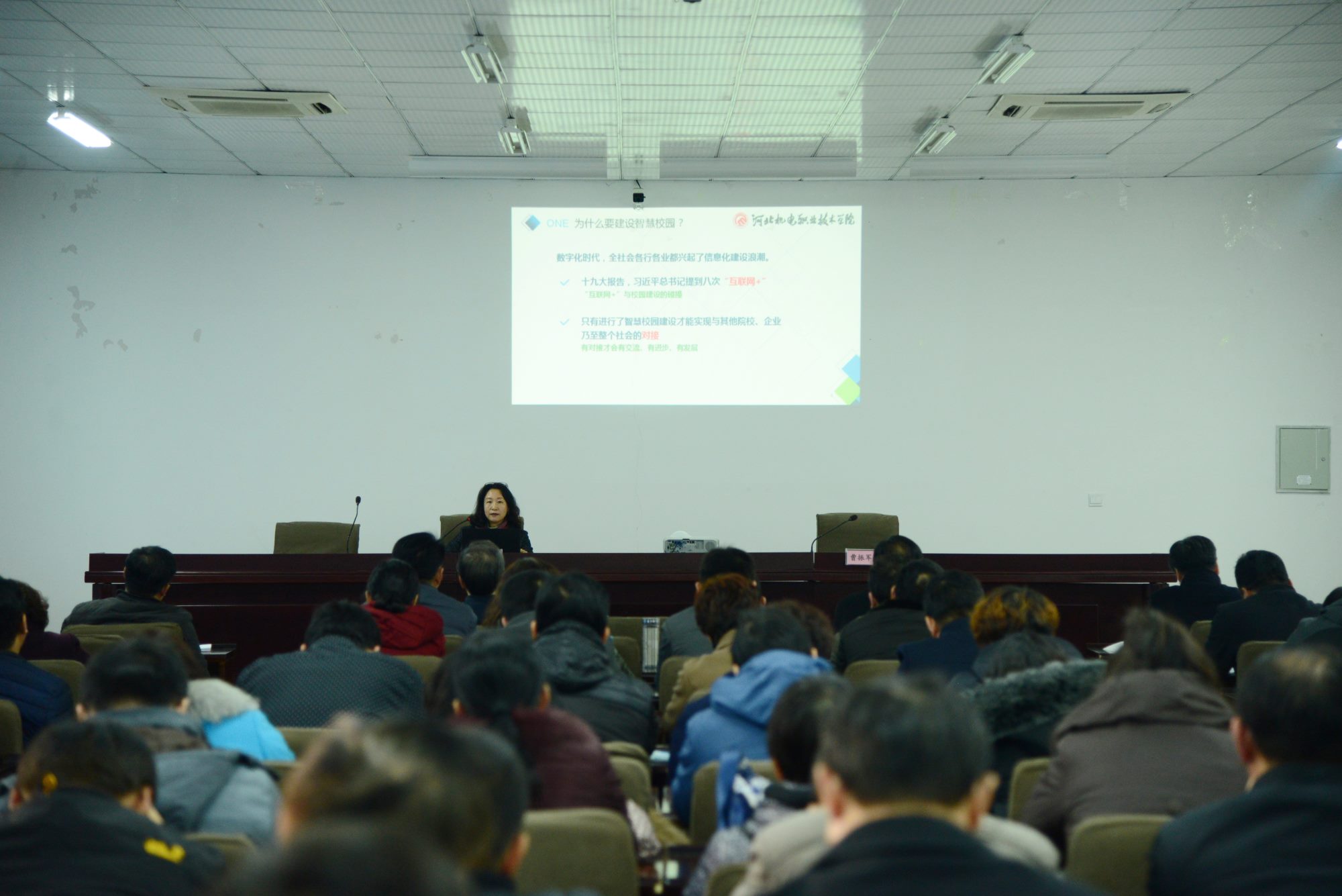现代教育技术中心万雅静主任从为什么要建设智慧校园、如何规划智慧校园建设、如何落实智慧校园建设、能为学校带来哪些便利、下一步我们应该怎么做等五个方面阐述了智慧校园建设方案。