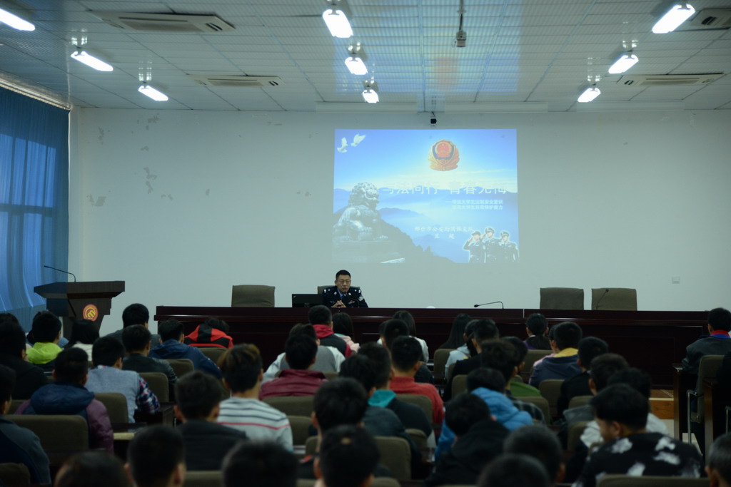 2017年11月14日下午,学院在C教105成功举办治安安全讲座。安全处聘请国际维和警察、邢台市公安局国保支队大队长兰超警官为主讲,国保支队副支队长张拥军出席讲座。讲座由安全处副处长胡占稳主持,参加讲座的还有主要学生干部和部分辅导员。