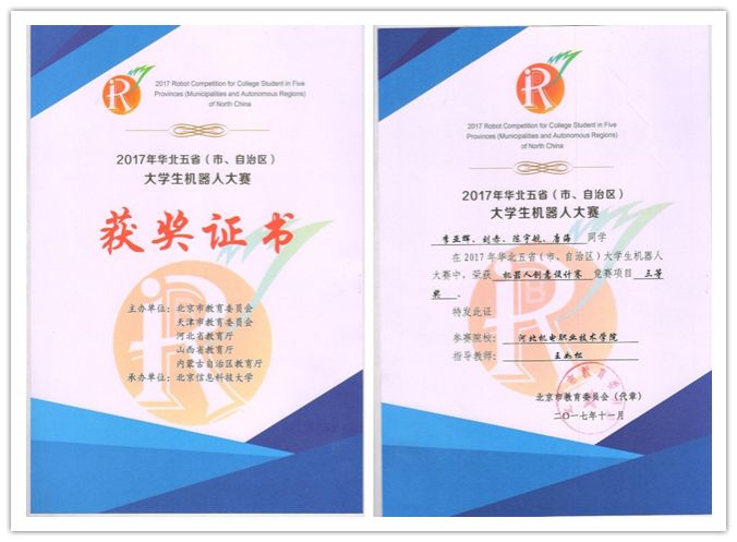 11月11日,“2017年华北五省(市、自治区)大学生机器人大赛”在北京大学生体育馆开赛。我院2015级本科自动化专业学生李亚辉、刘赤、唐海与2016级工业机器人技术专业学生陈宇航四名学生在机器人创意设计赛中获得佳绩。